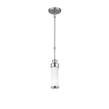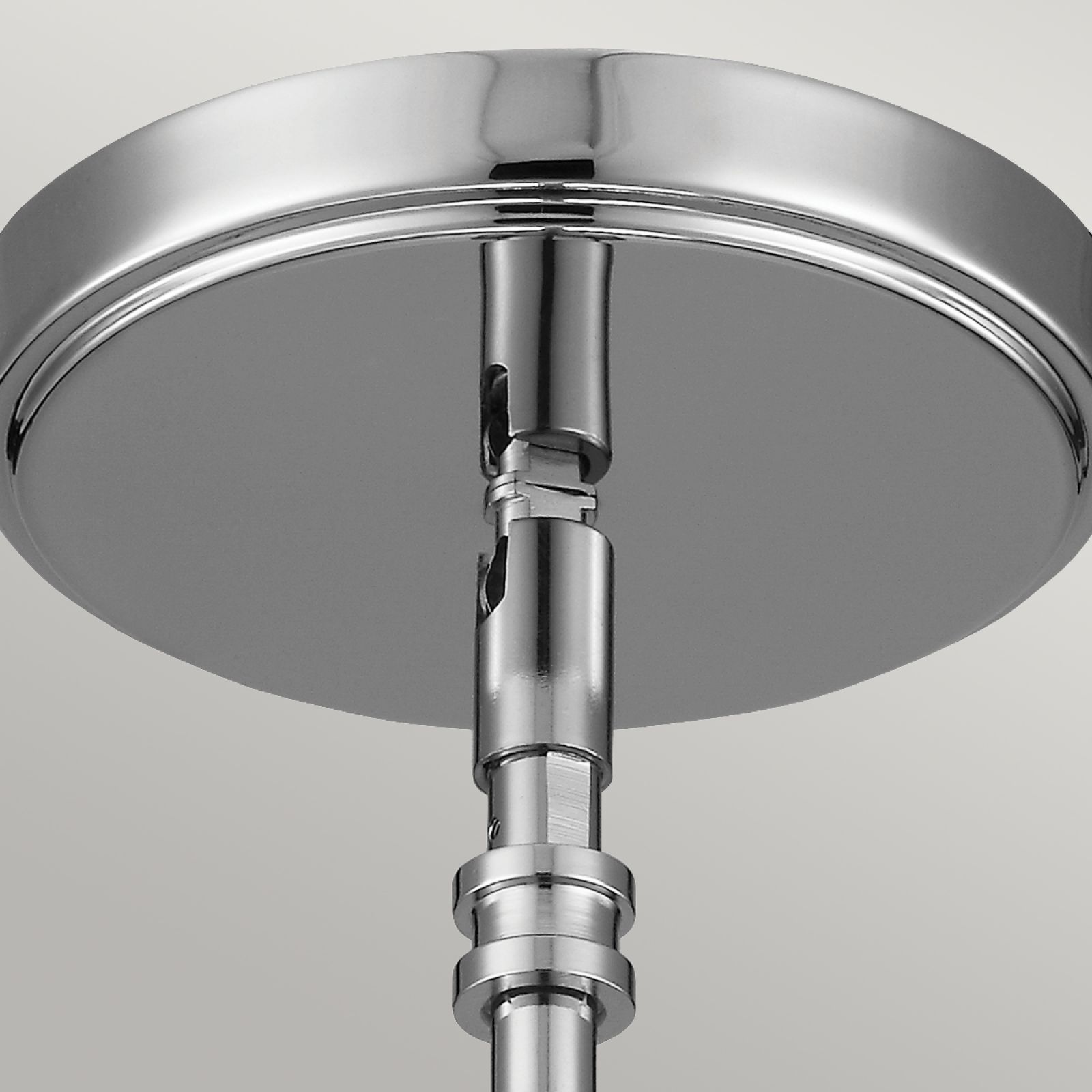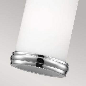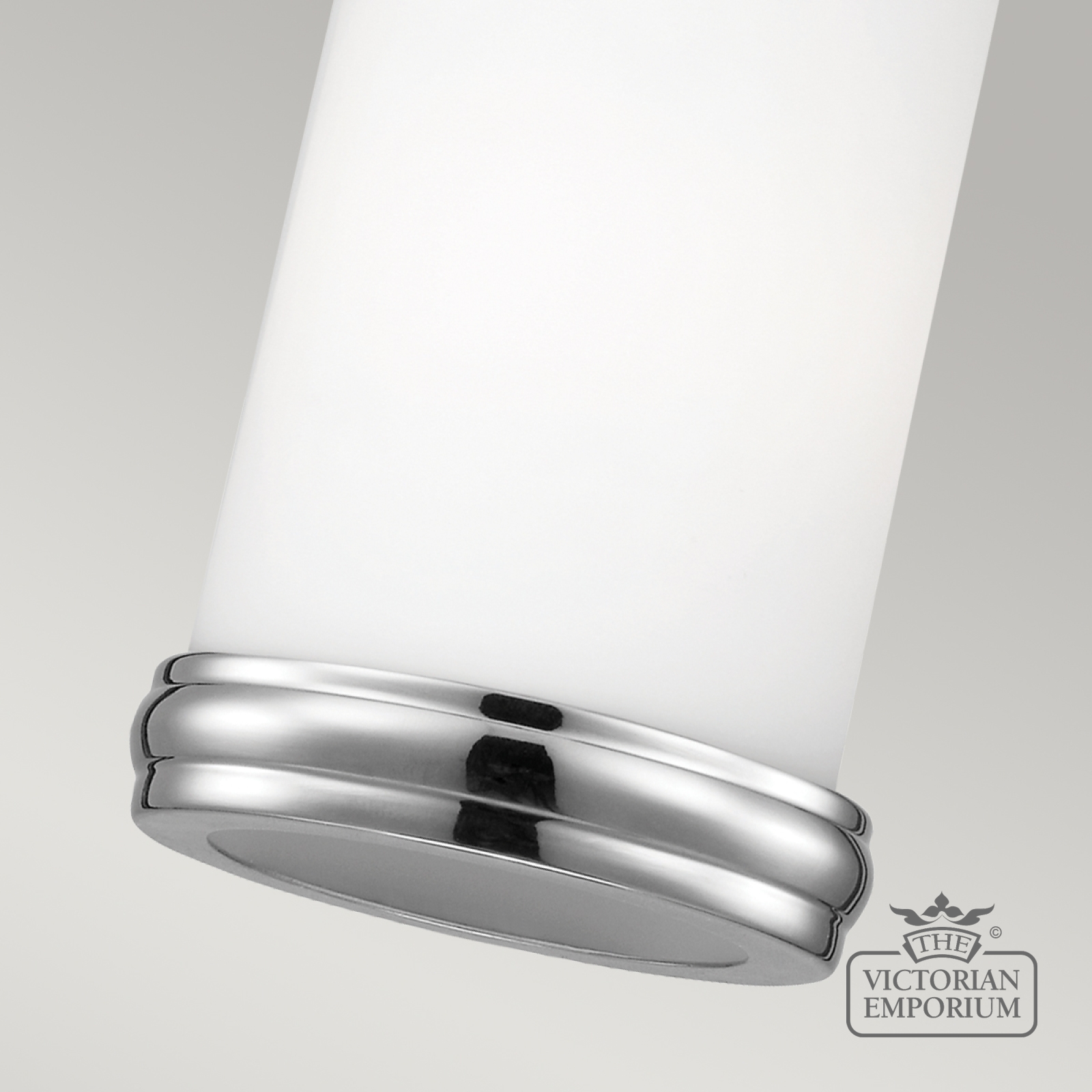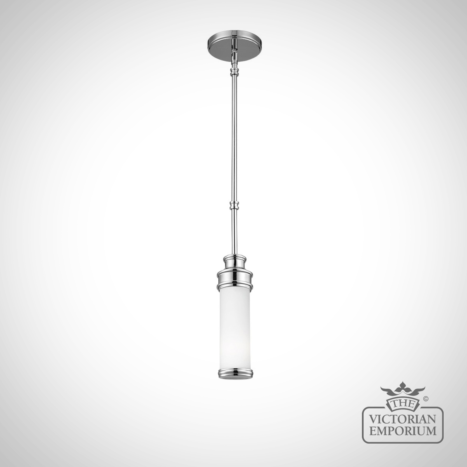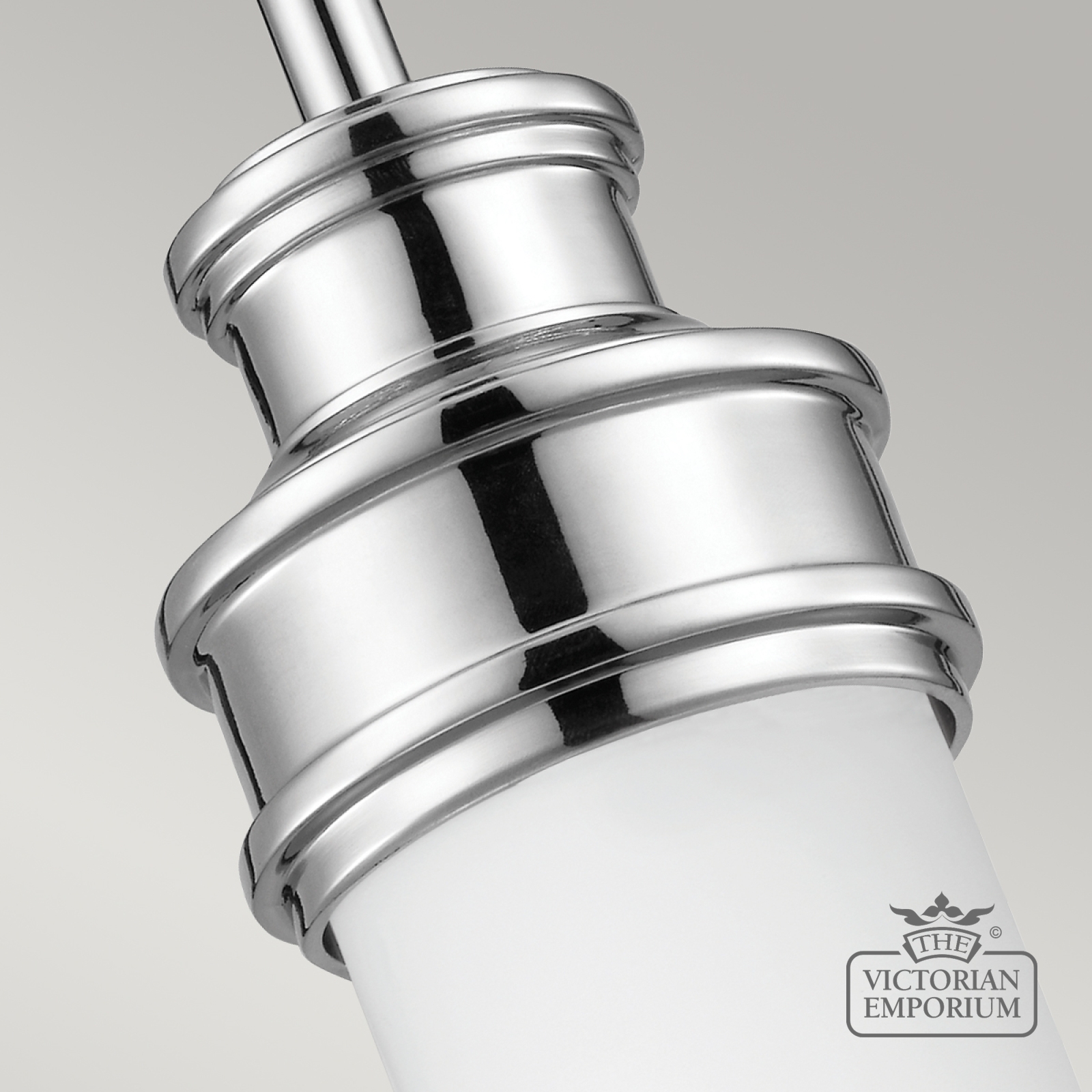 Single pendant light for a bathroom with clean, white, opal etched glass detailed spun metal rings in polished chrome