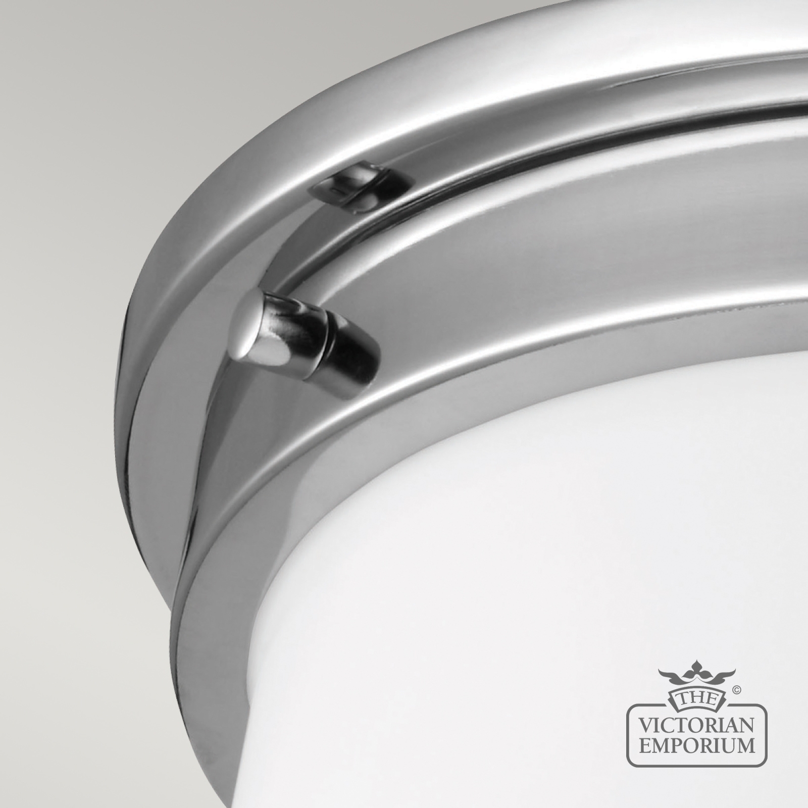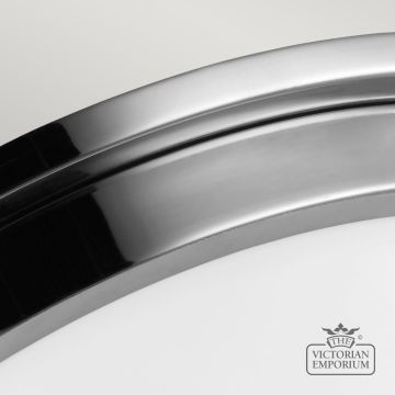 Flush mount bathroom light with clean, white, opal etched glass and polished chrome detail