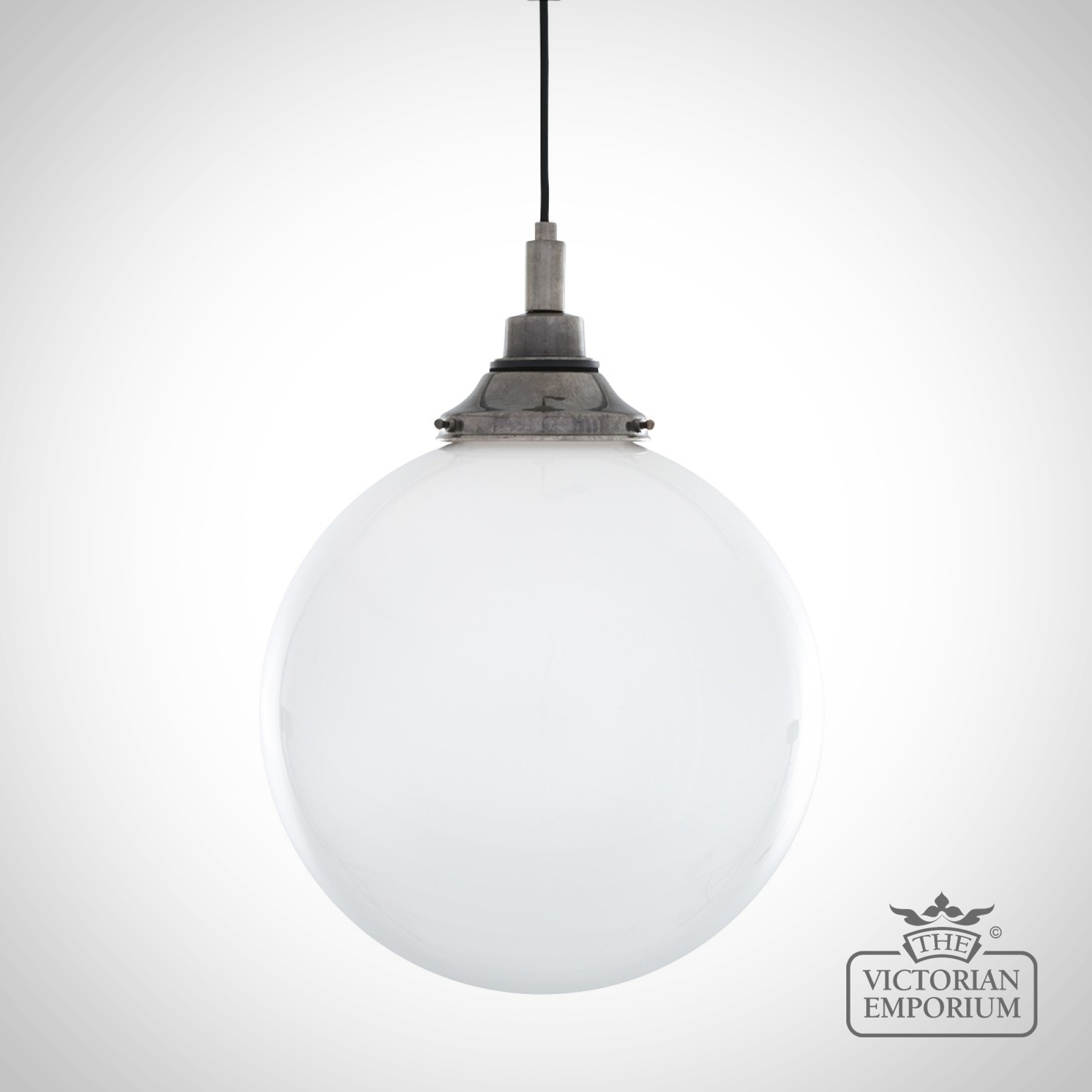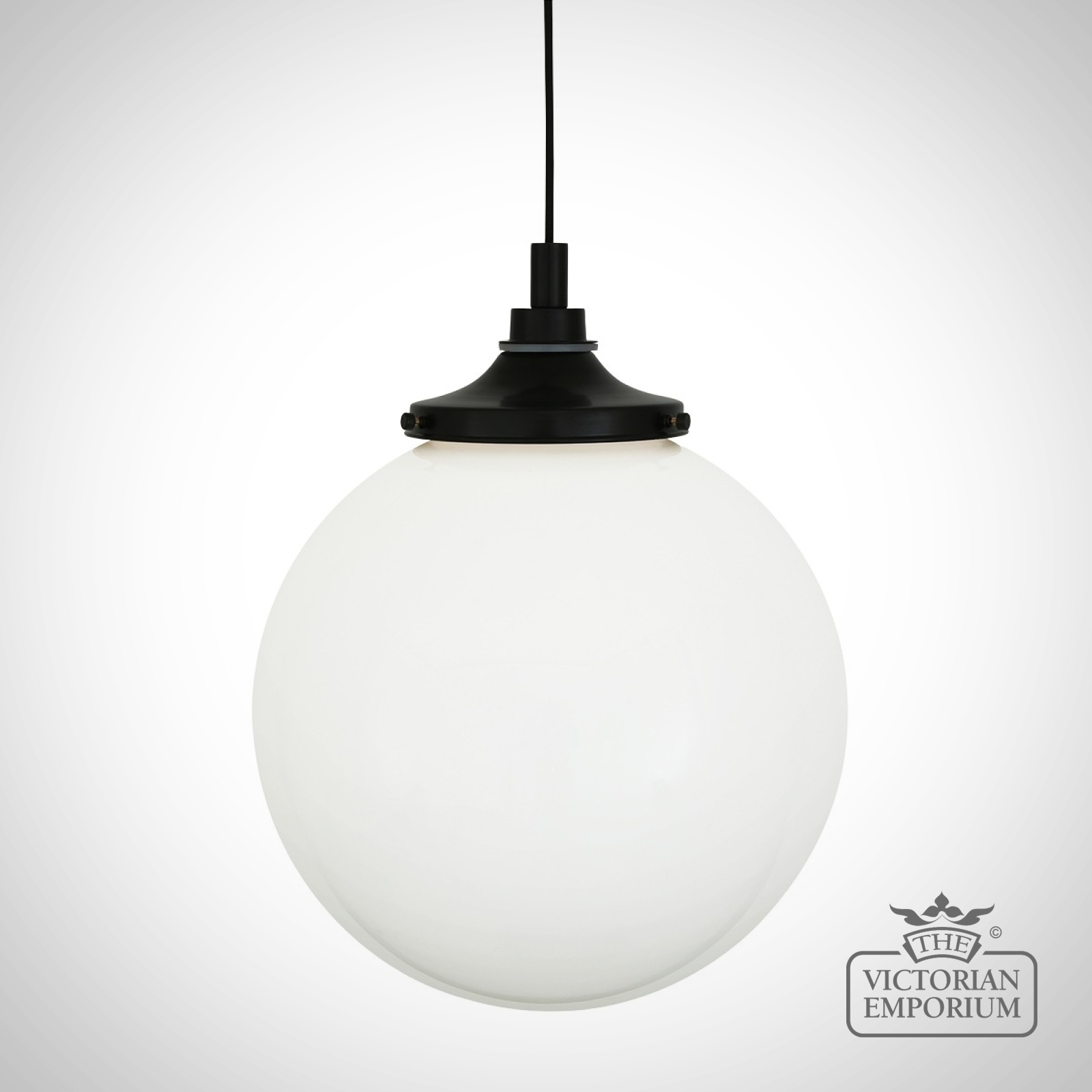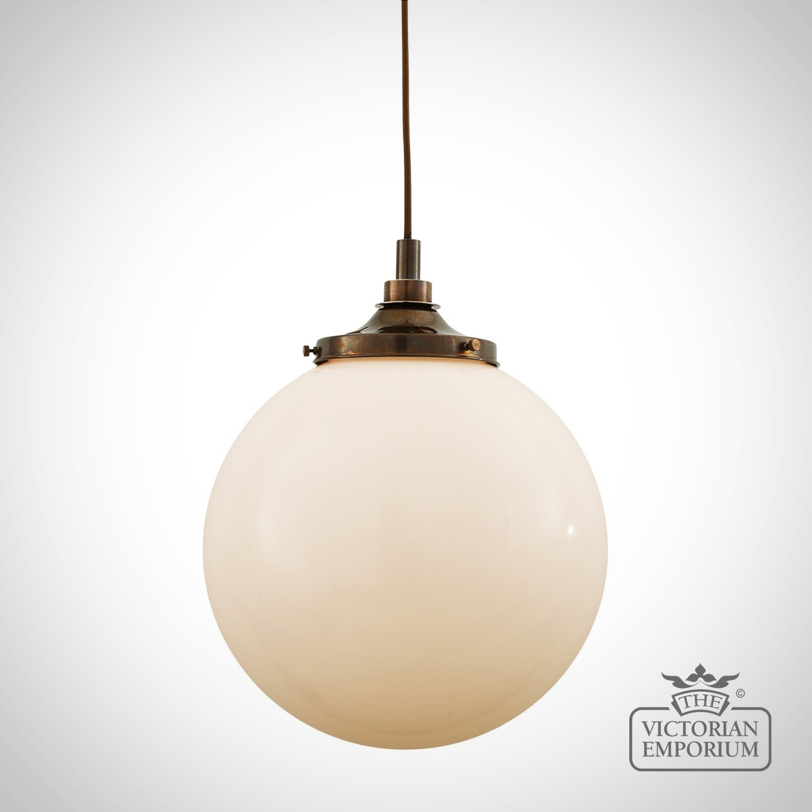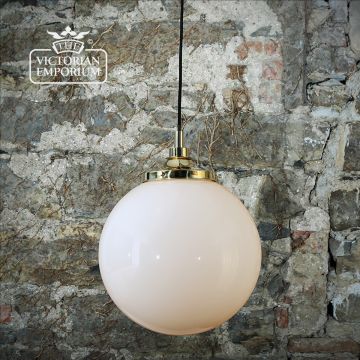The Pelagio pendant is a glass globe pendant light with a choice of 4 sizes of opal glass shade attached to a sealed brass gallery. A matching ceiling rose is supplied with each globe pendant light.