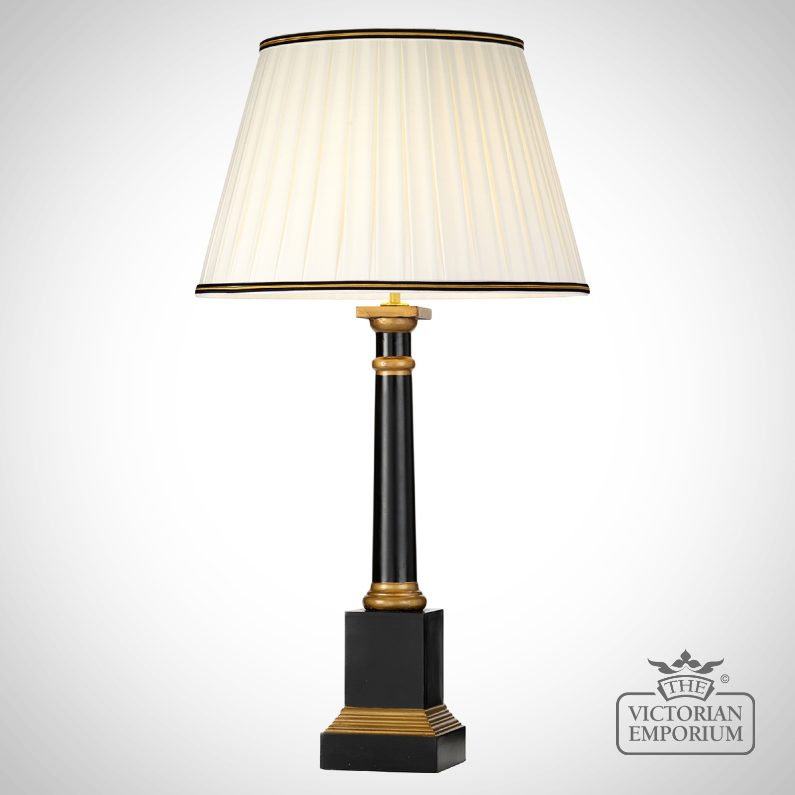 A Black wood column base with gold painted accents. Including an Ivory 100% 31cm cotton, box pleat shade with black and gold trim.