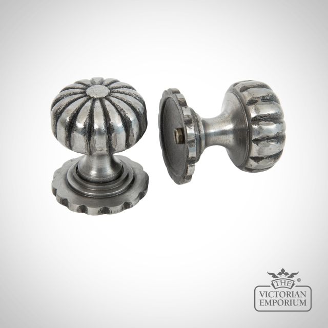A cabinet knob with removable base in an antiqued pewter finish. Ideal on cupboard doors, kitchen cabinets and a multitude of other areas. Choice of two sizes.