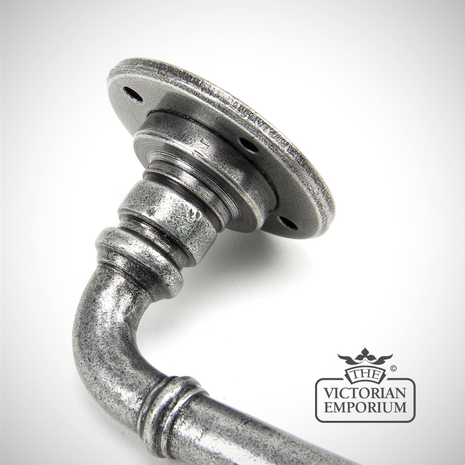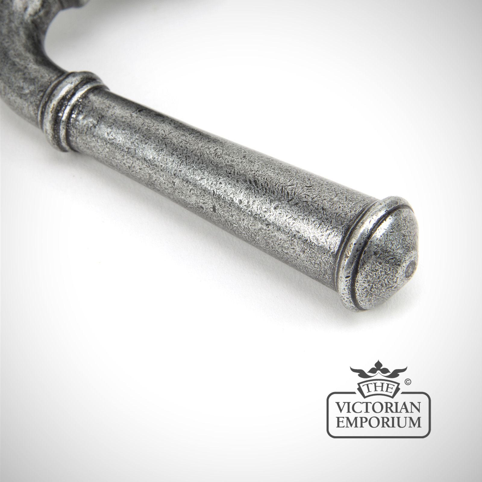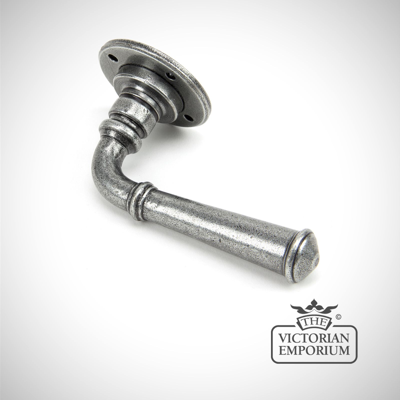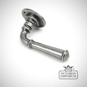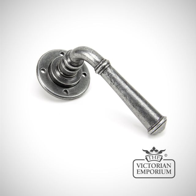 A classic Regency style lever on a rose handle in a rustic pewter finish, featuring a simple round backplate, which complements the smooth rounded lever.