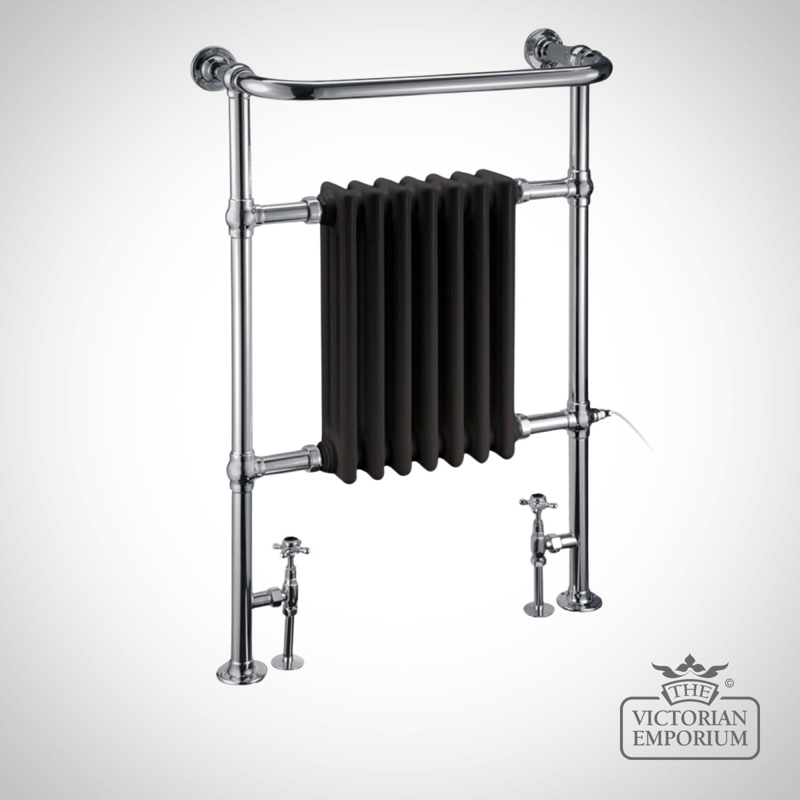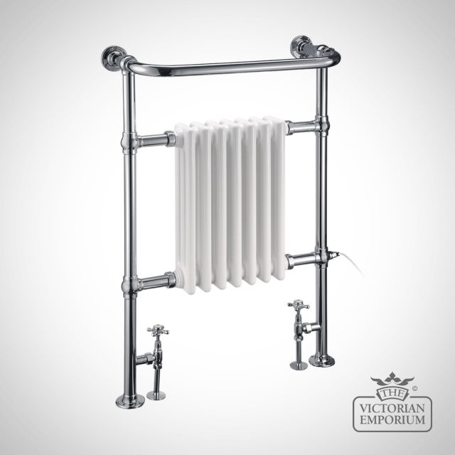 Medium steel heated towel rail in a chrome finish with medium sized off white central section with columns.