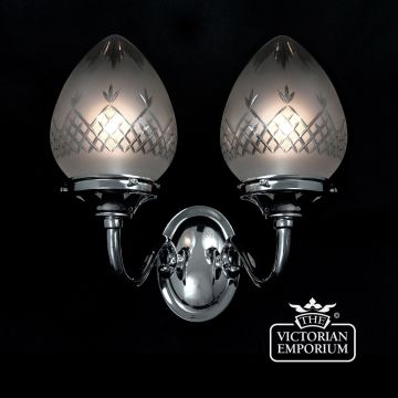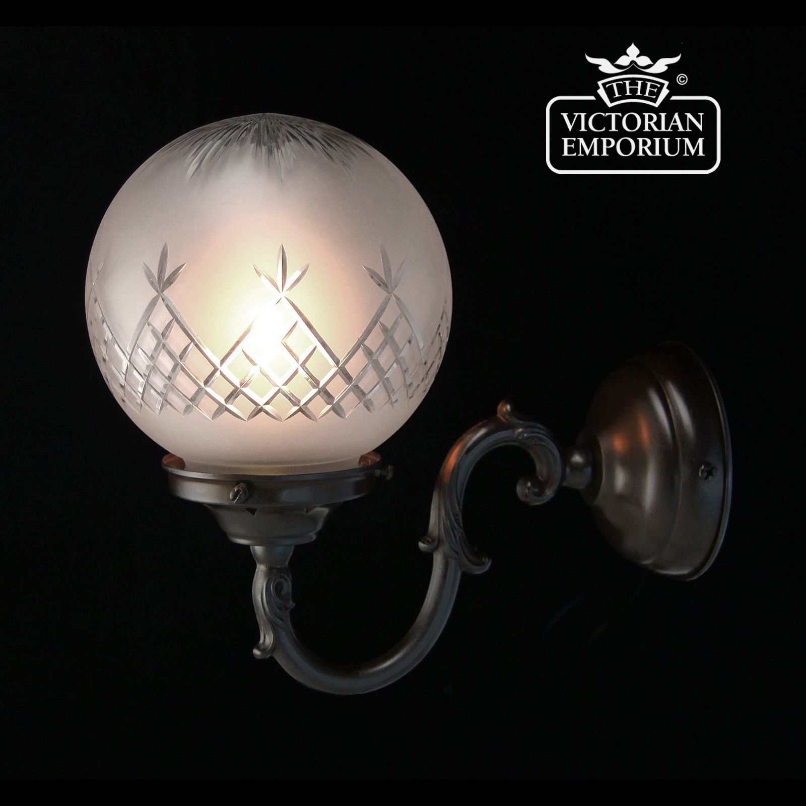 This is an elegant globe wall light with intricate cut glass shades and antique bronze metalwork