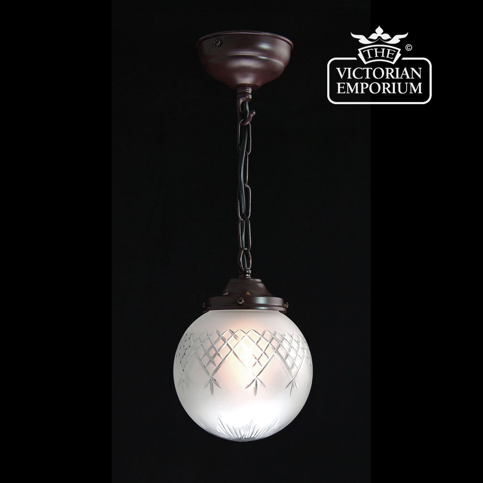This is a round decorative etched cut glass ceiling pendant with antique bronze metalwork and a pineapple design