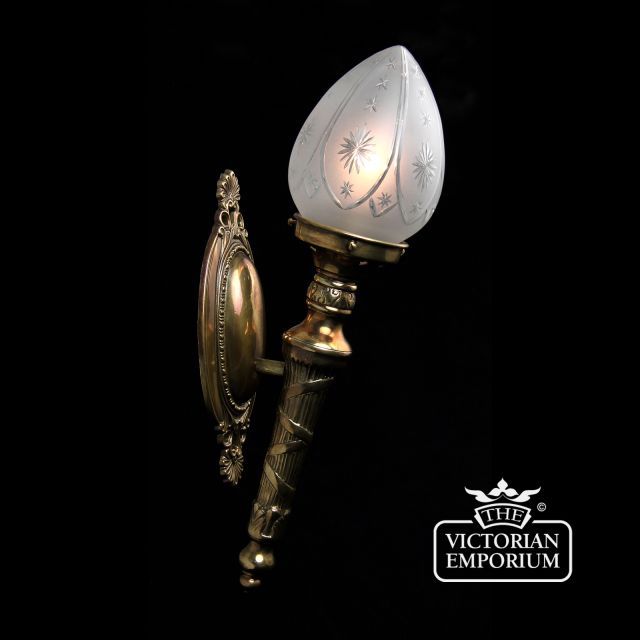 This is a very pretty wall light with intricate cut glass shades and distressed brass metalwork