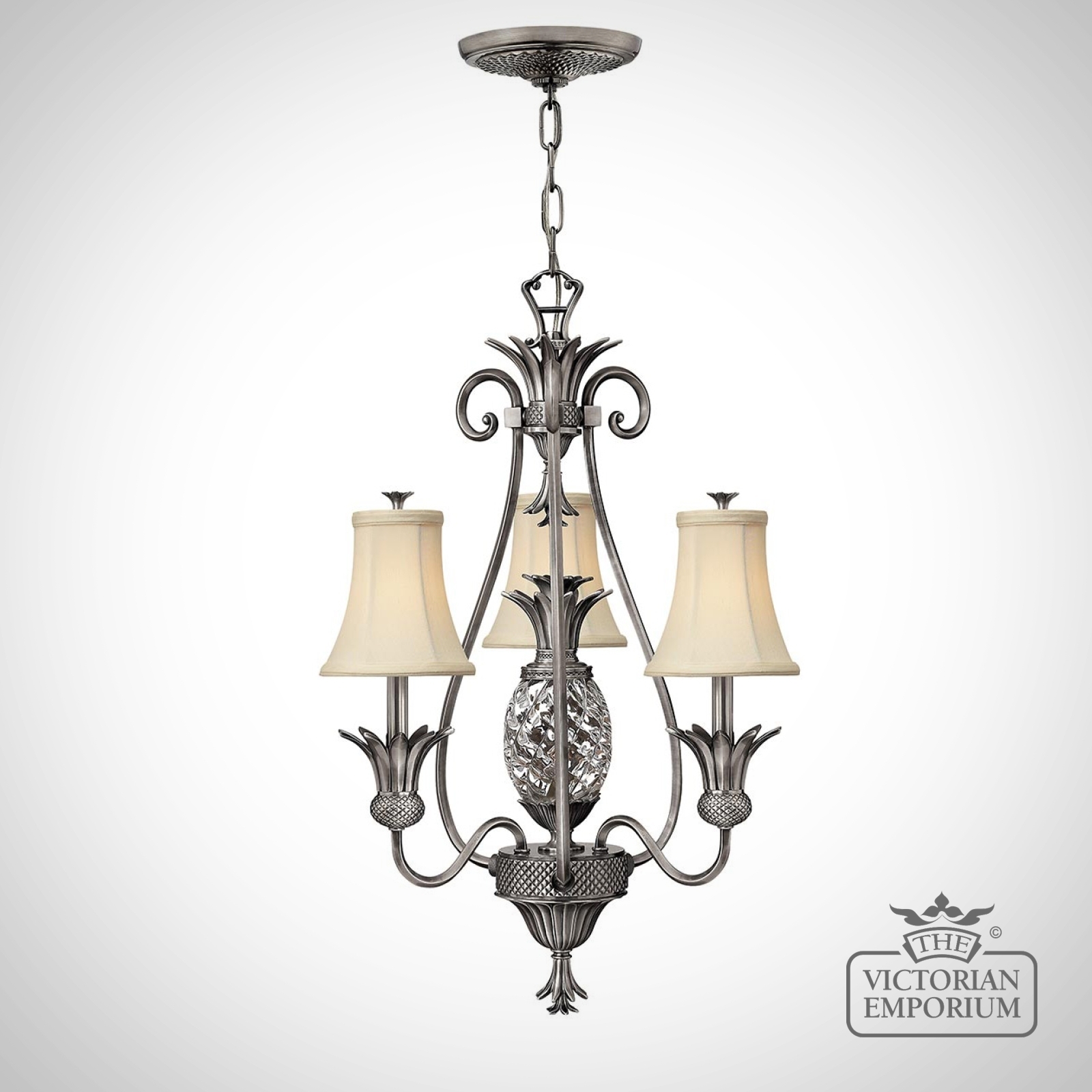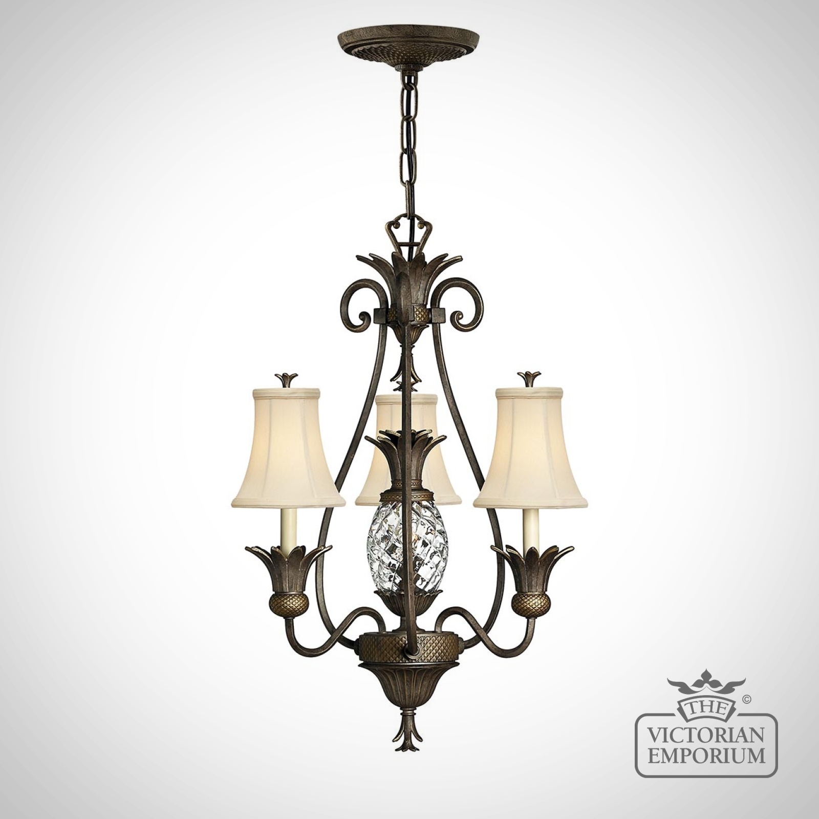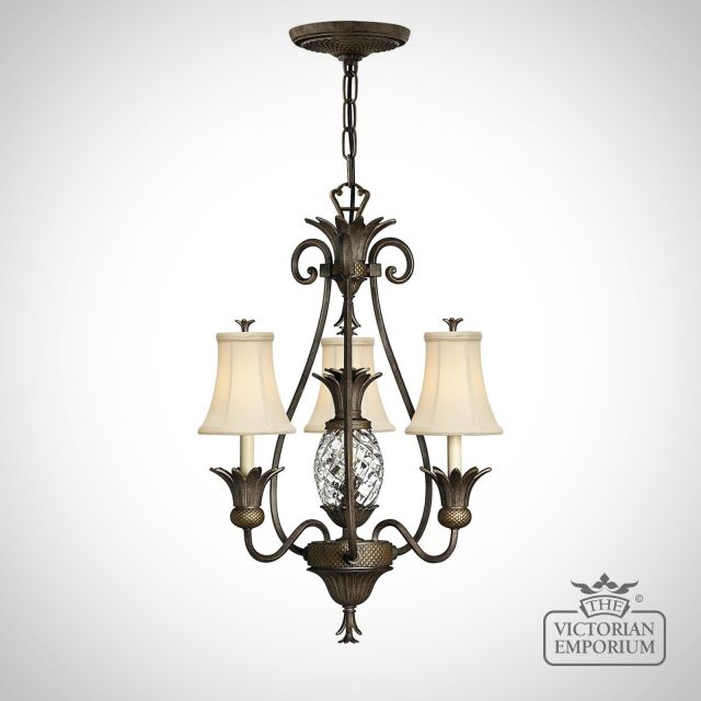 Plantation style chandelier with pineapple shape glass centre and clear optic glass. Shades in ivory silk, off white candle sleeves and decorative cast detailing.