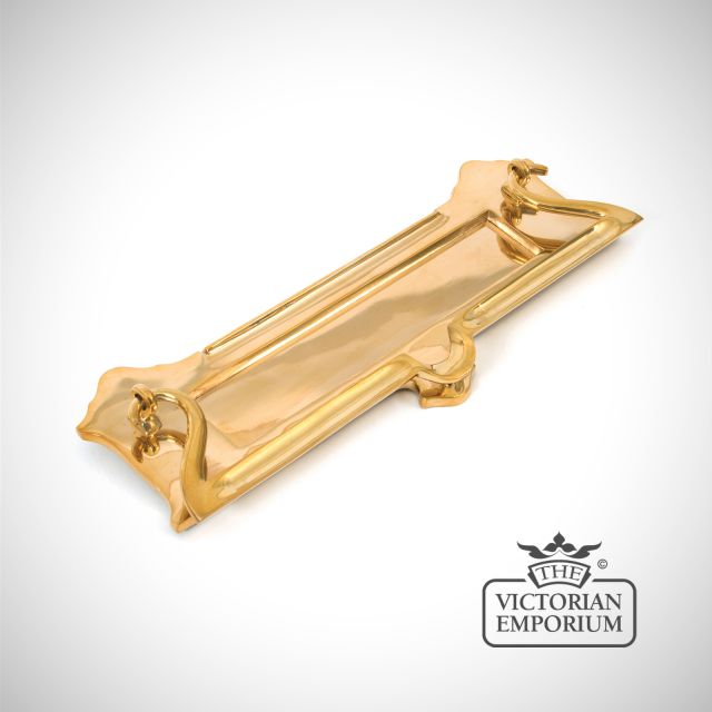 A decorative letterplate made from solid brass with a traditional style in an un-laquered highly polished finish and would therefore need regular polishing to keep it shiny.