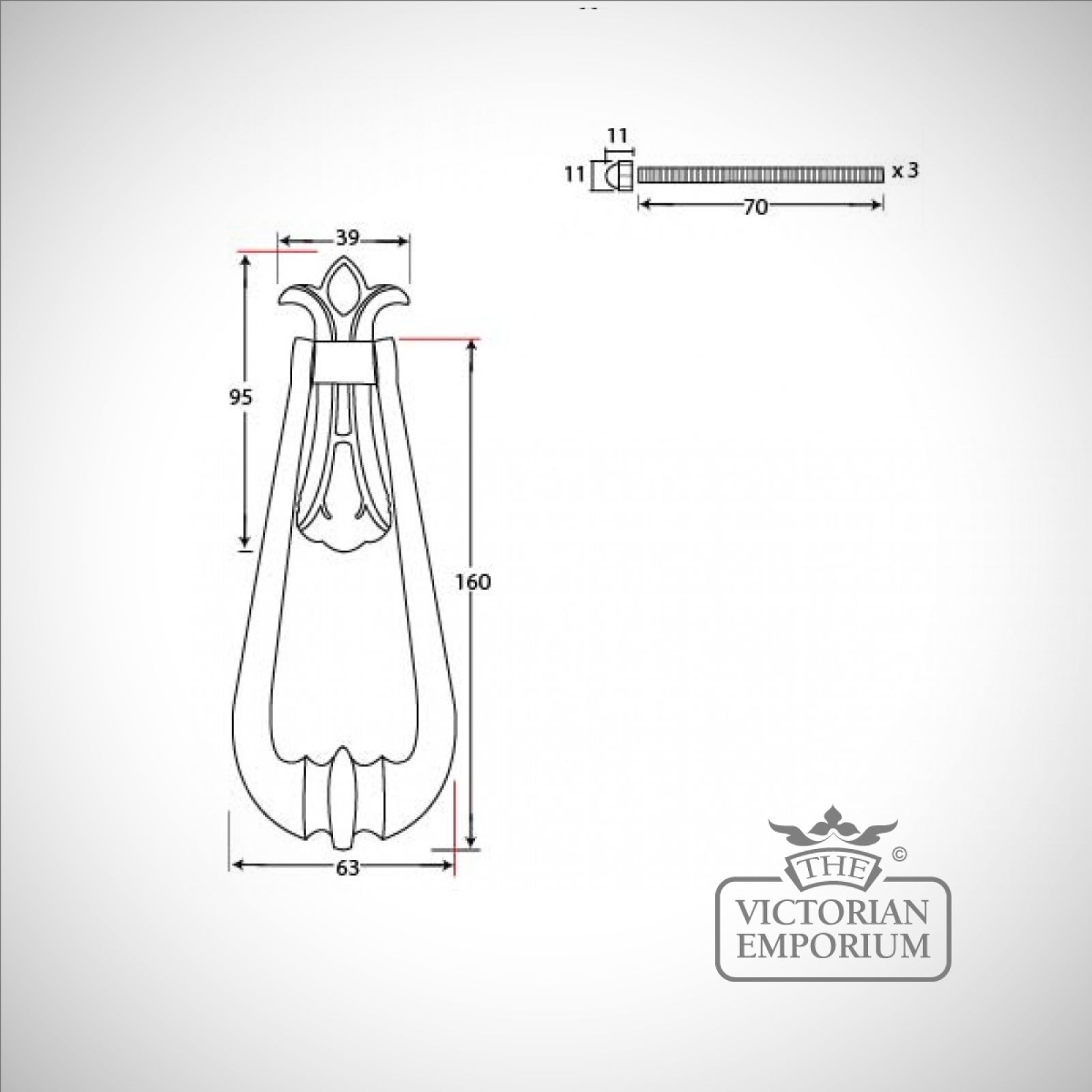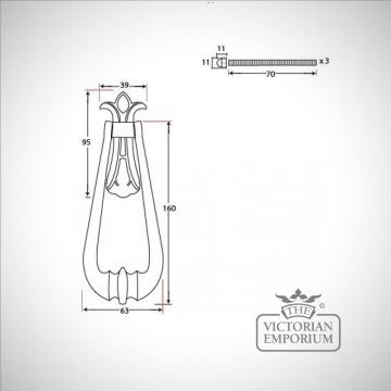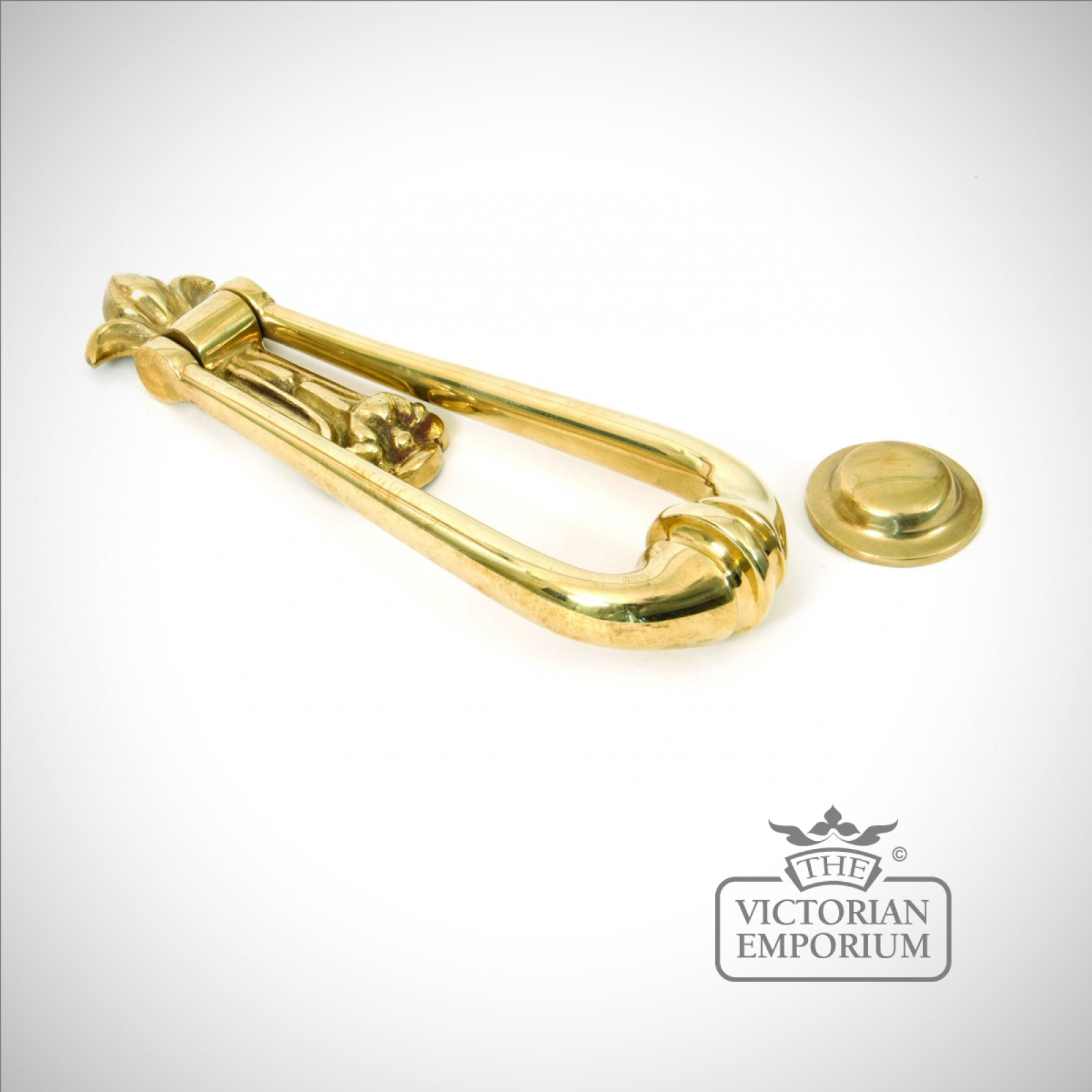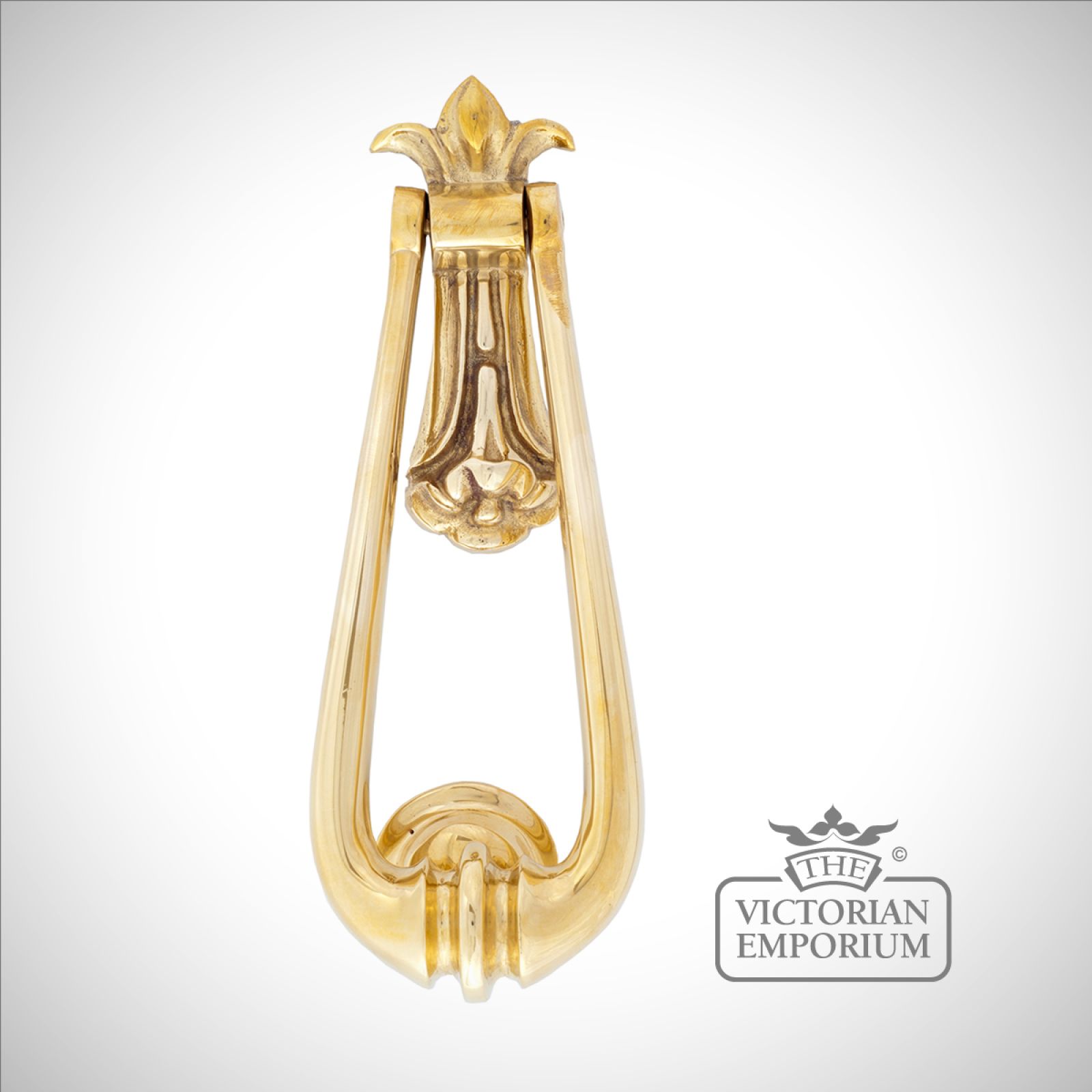 Solid brass Victorian style Knocker in a solid brass finish, designed for narrow centre door panels. It has a large striking plate and is fixed with two hexagonal brass nuts which bolt through your door
