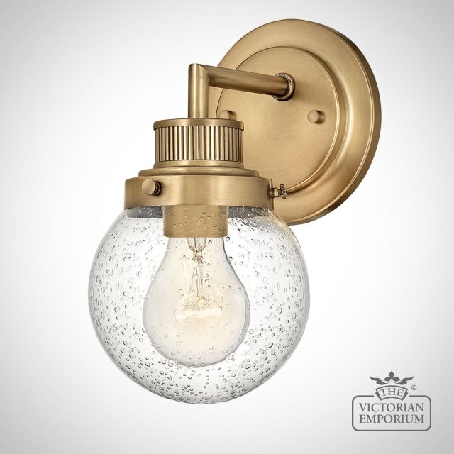 Single Bathroom Wall Light featuring a Heritage Brass finish in a mid-century style with industrial elements. This beautiful bathroom light is made from Steel, Clear Seeded Glass in