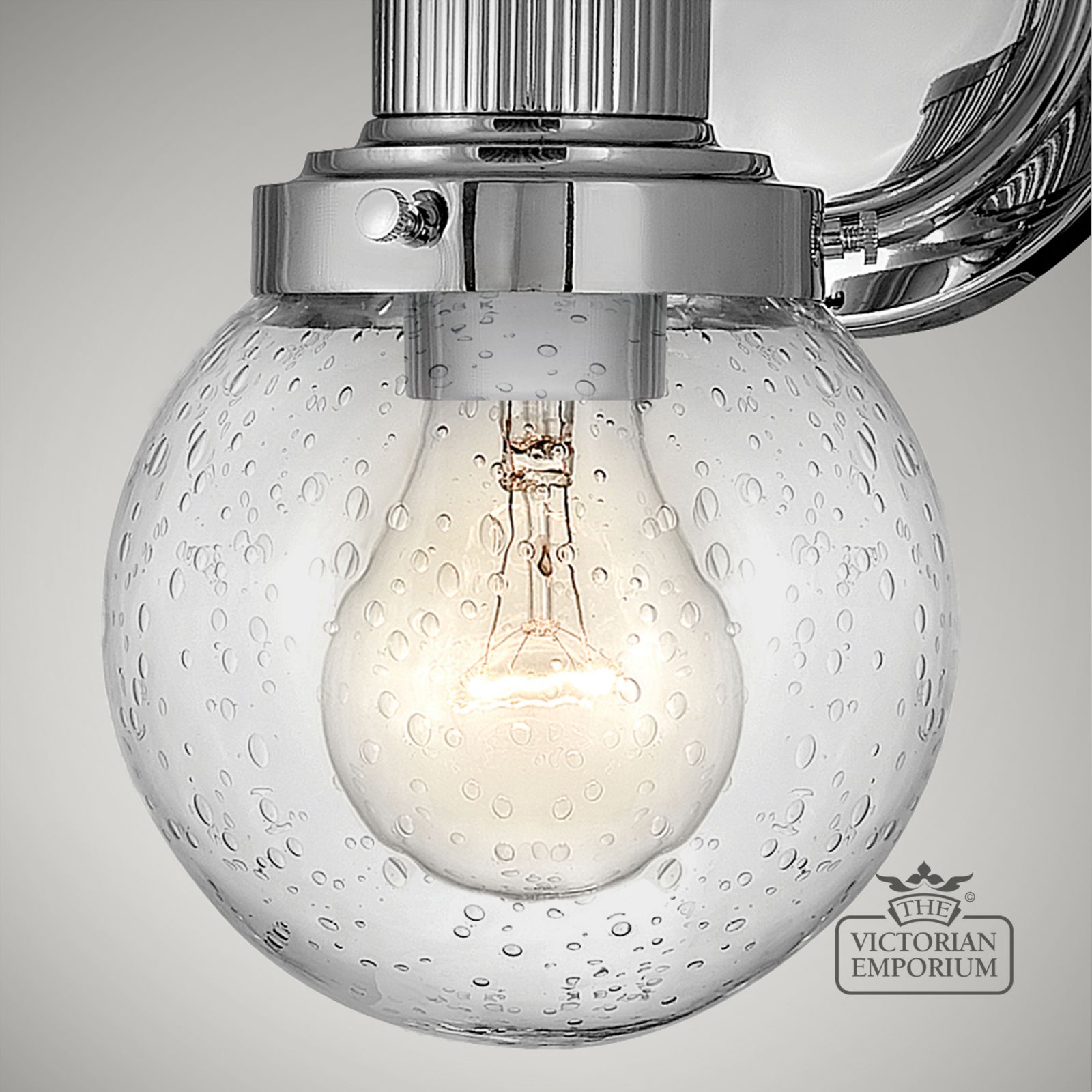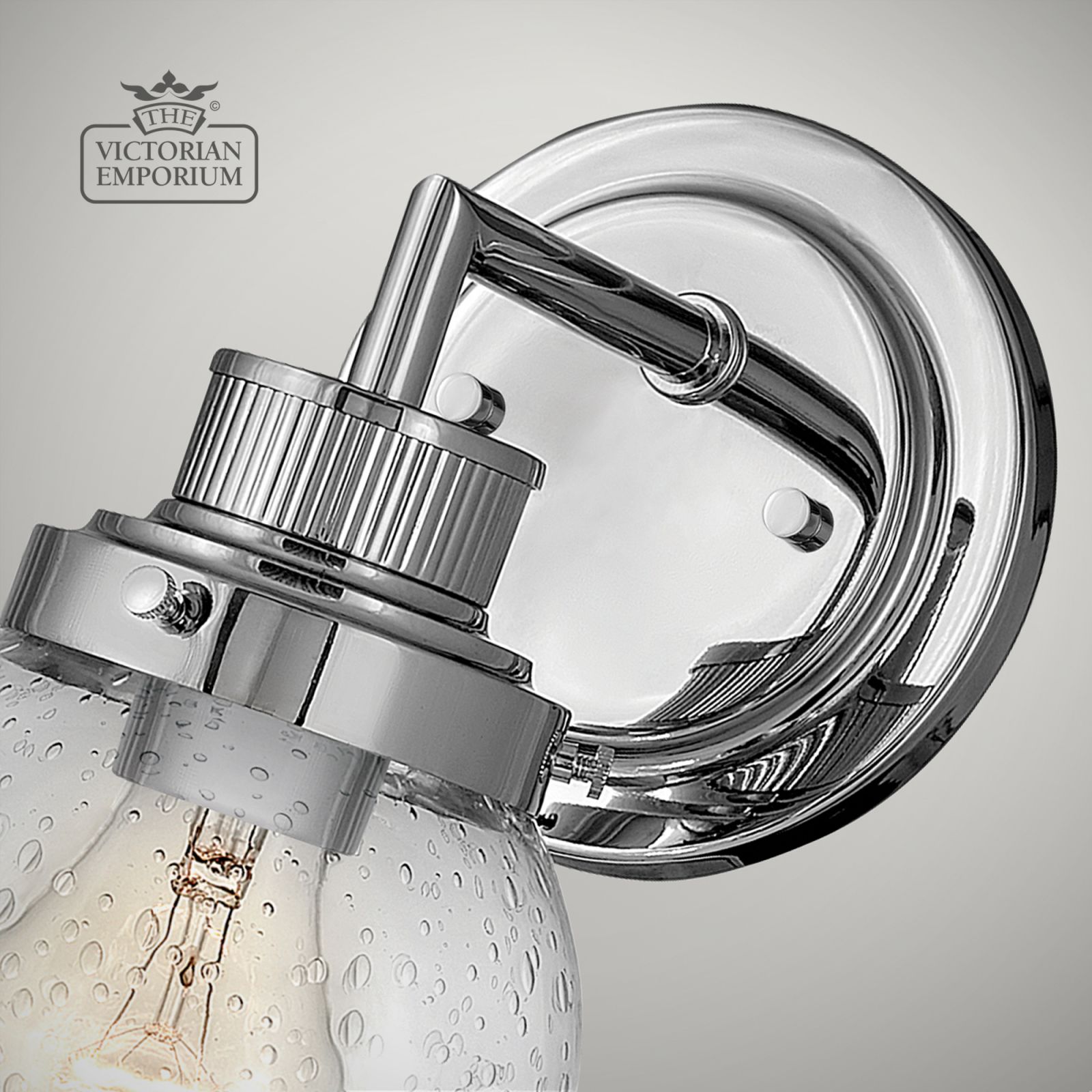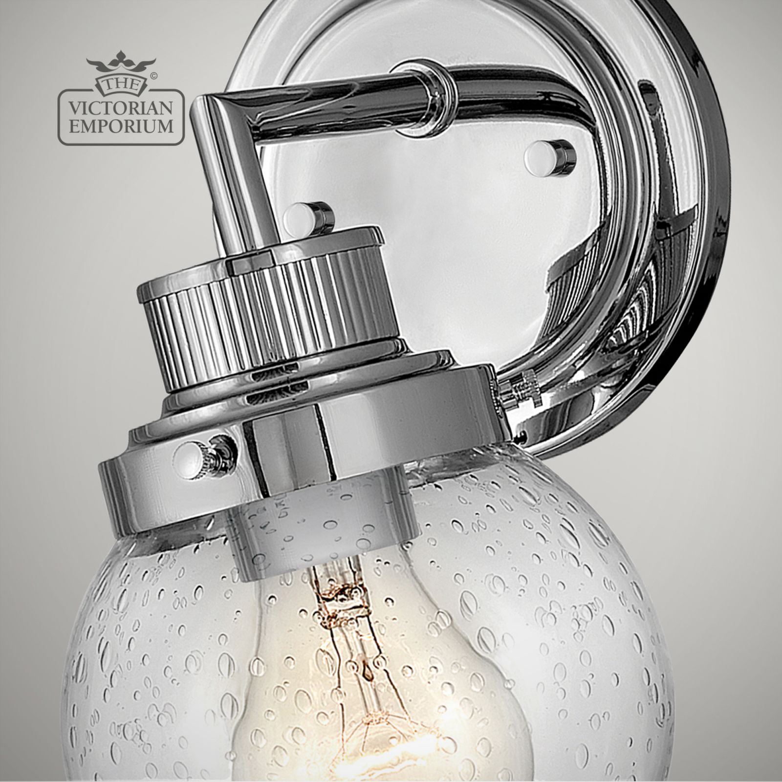 Single Bathroom Wall Light featuring a Polished Chrome finish in a mid-century style with industrial elements. This beautiful bathroom light is made from Steel, Clear Seeded Glass