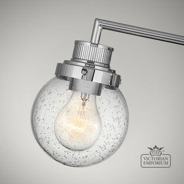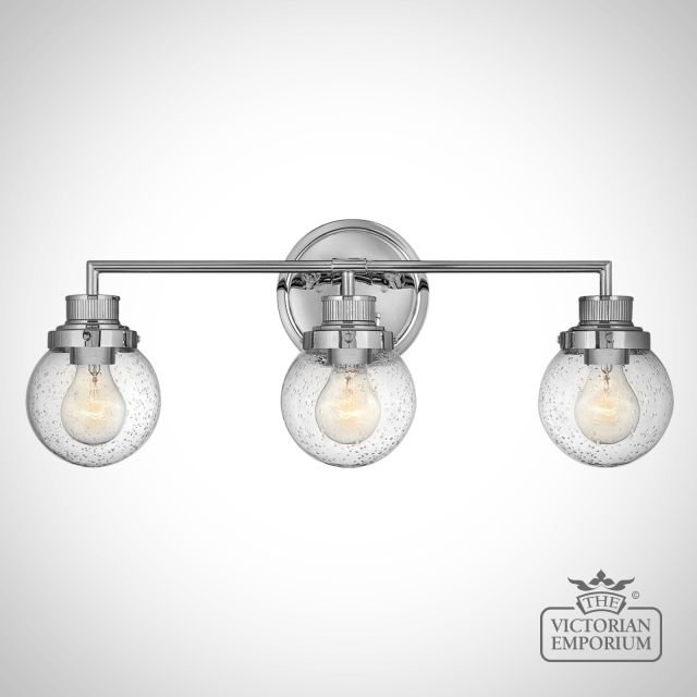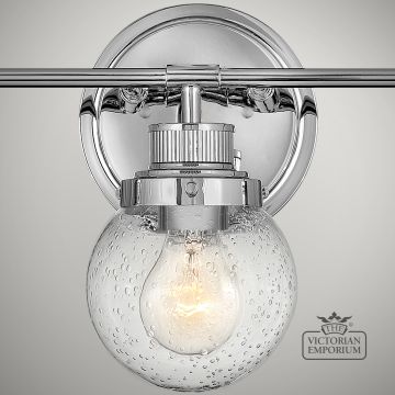 Triple Bathroom Wall Light featuring a Polished Chrome finish in a mid-century style with industrial elements. This beautiful bathroom light is made from Steel, Clear Seeded Glass