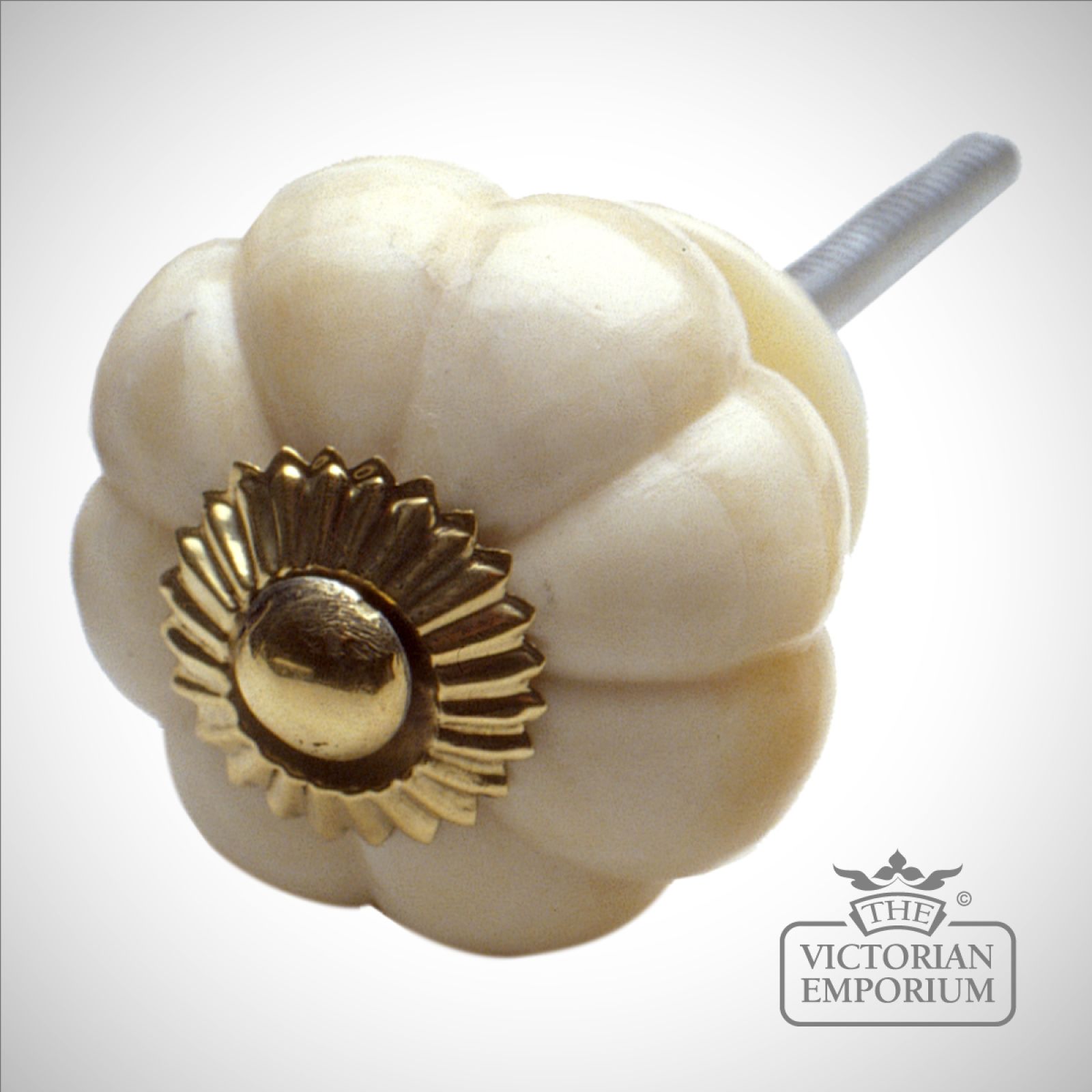 A small cabinet knob in the shape of a pumpkin made of porcelain, a great choice for a period style kitchen