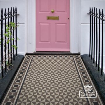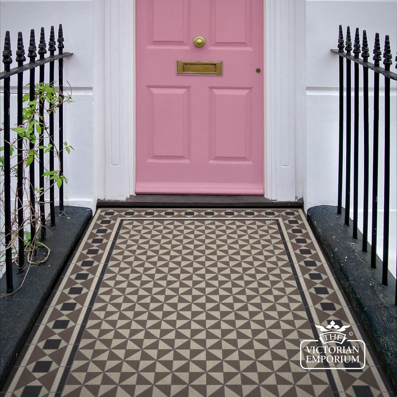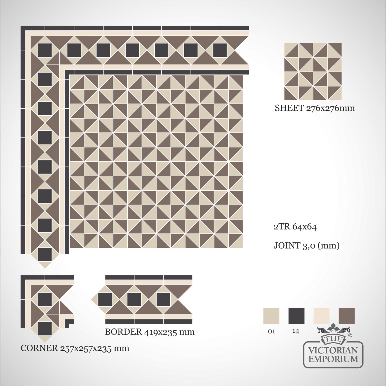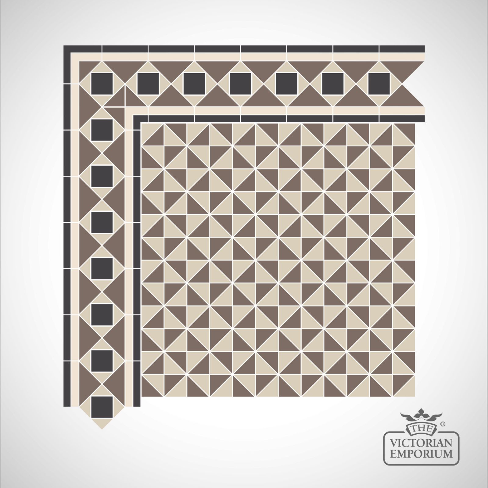 Victorian mosaic centre pattern tiles in a Victorian colour palette of brown, buff and black - sold by the sheet.