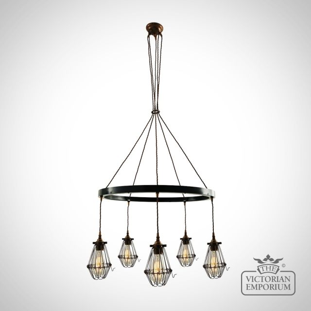 The Praia 1 Tier Chandelier with round ceiling tier featuring five cage lighting bulbs is steampunk lighting at it’s best.