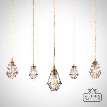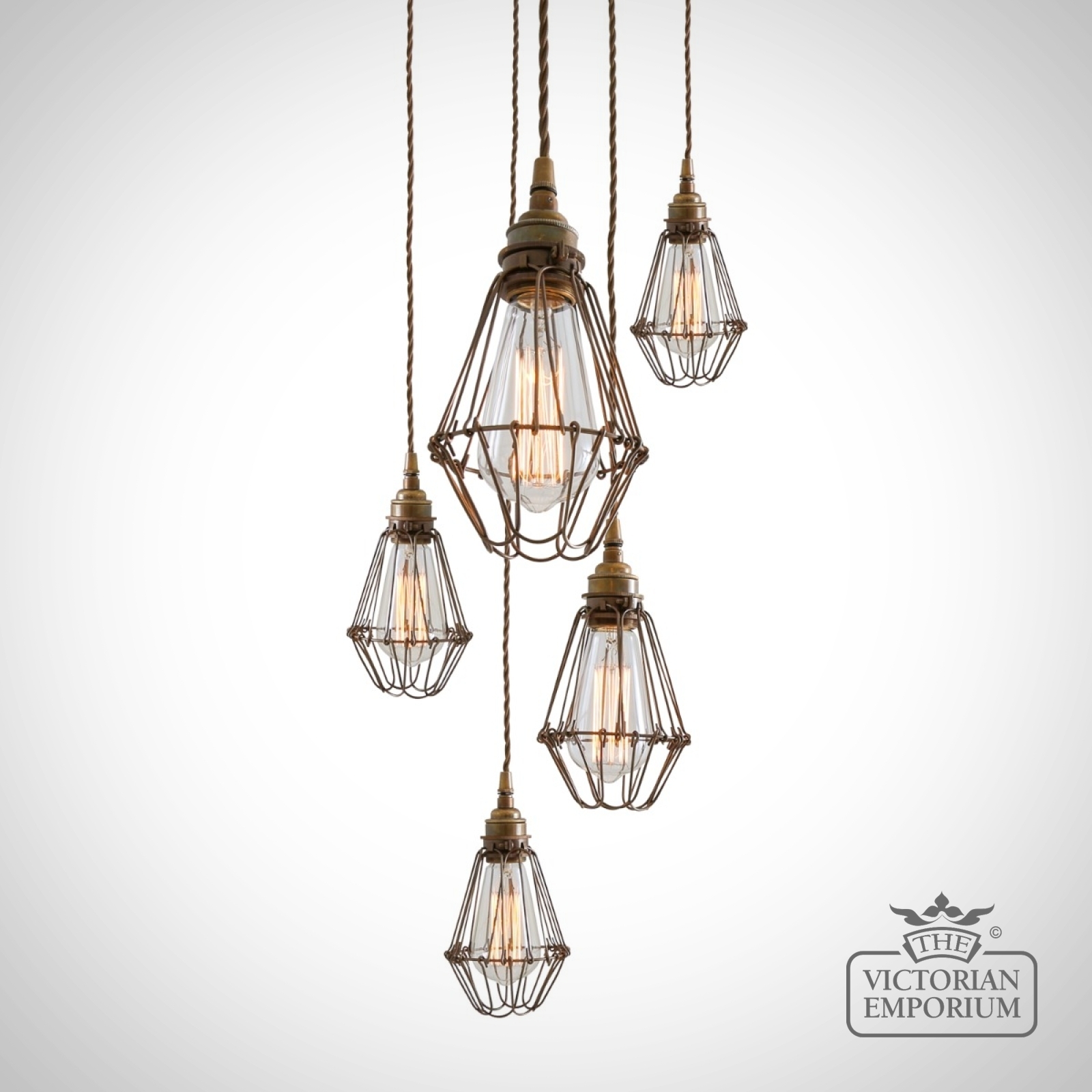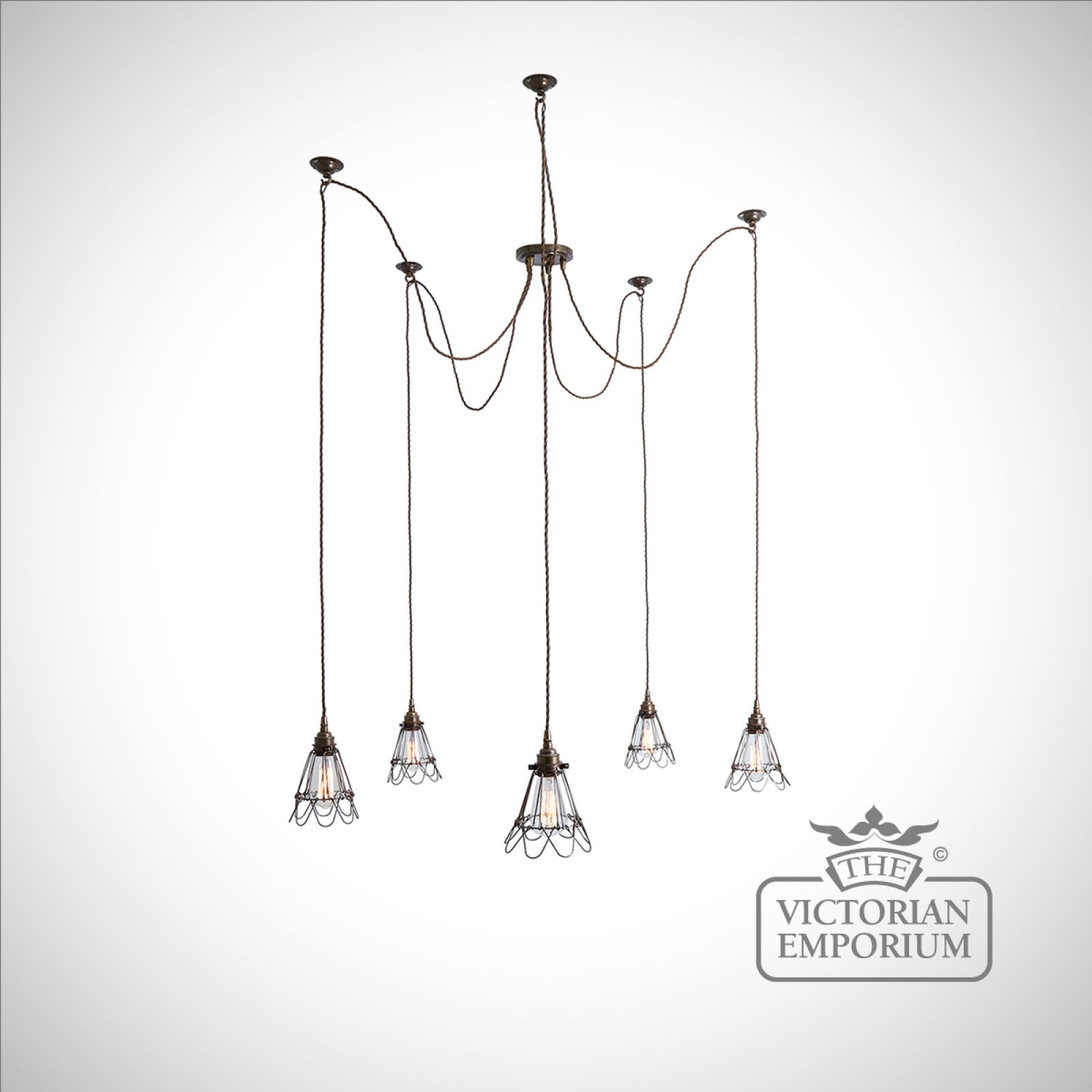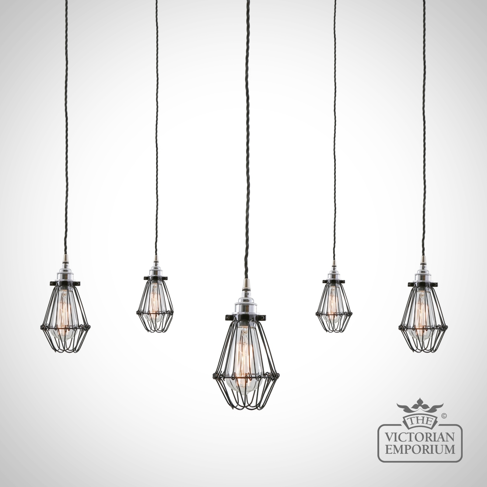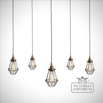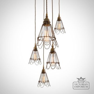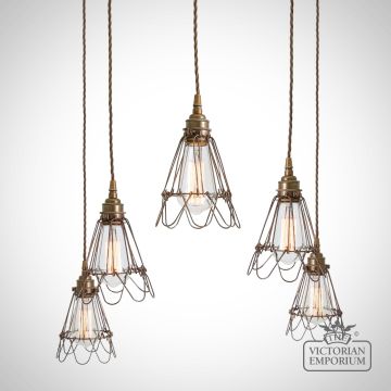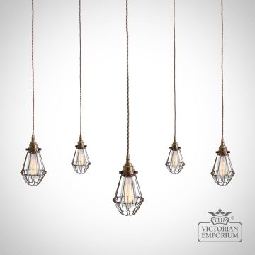 With the adjustable opening at the bottom of the cage, and the adjustable ceiling hooks, this cage pendant light can be altered easily to suit your own preference. Comes as standard with 5 suspensions from one ceiling rose. Additional or less suspensions can be provided on request.