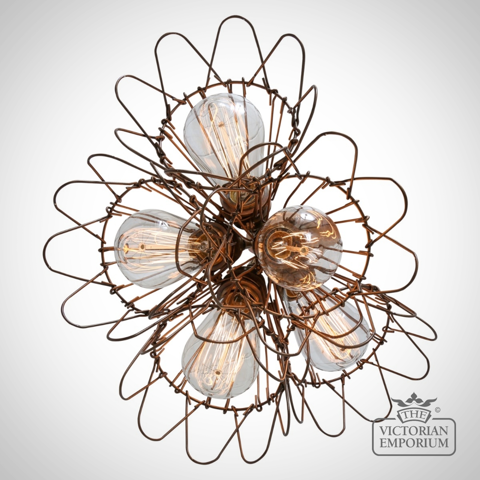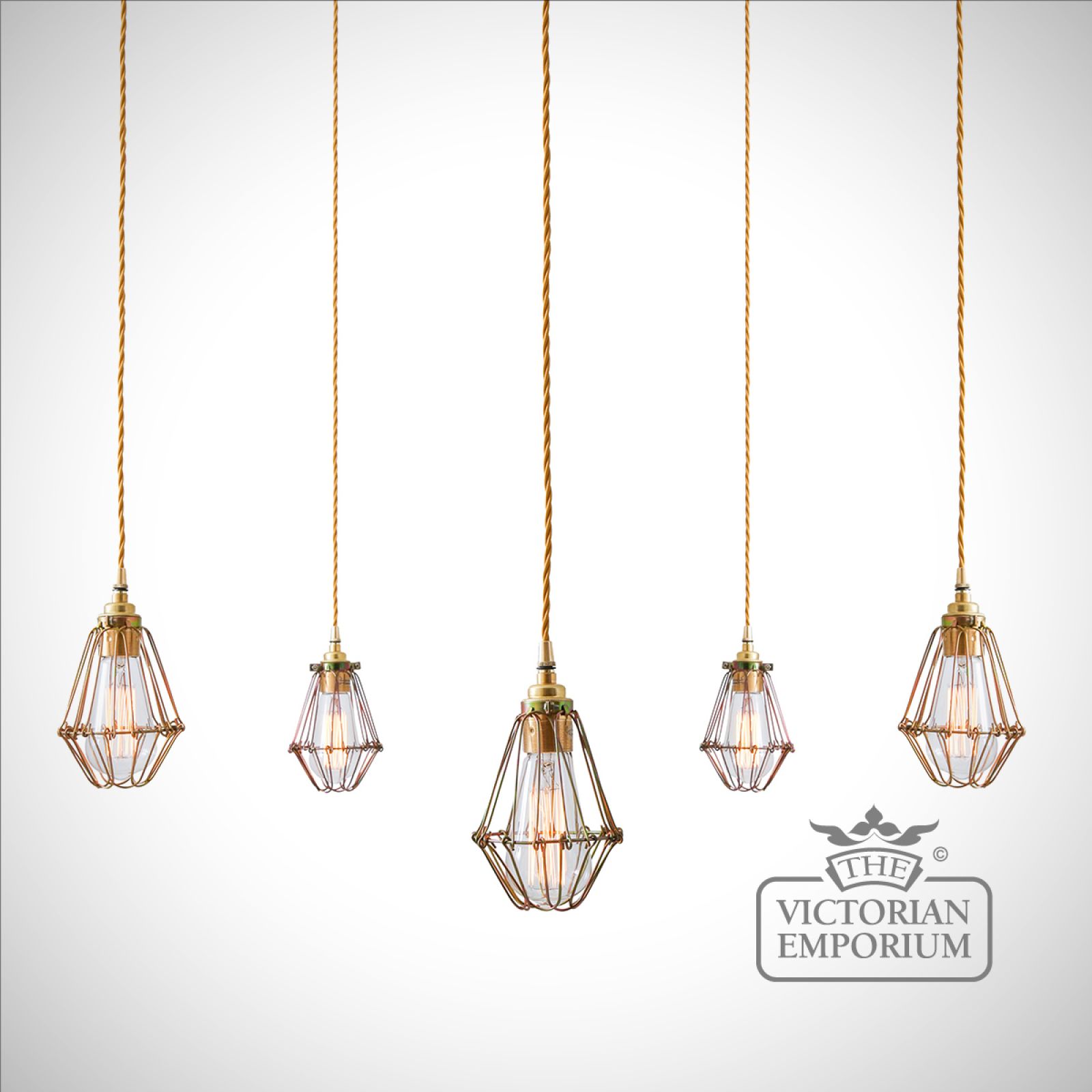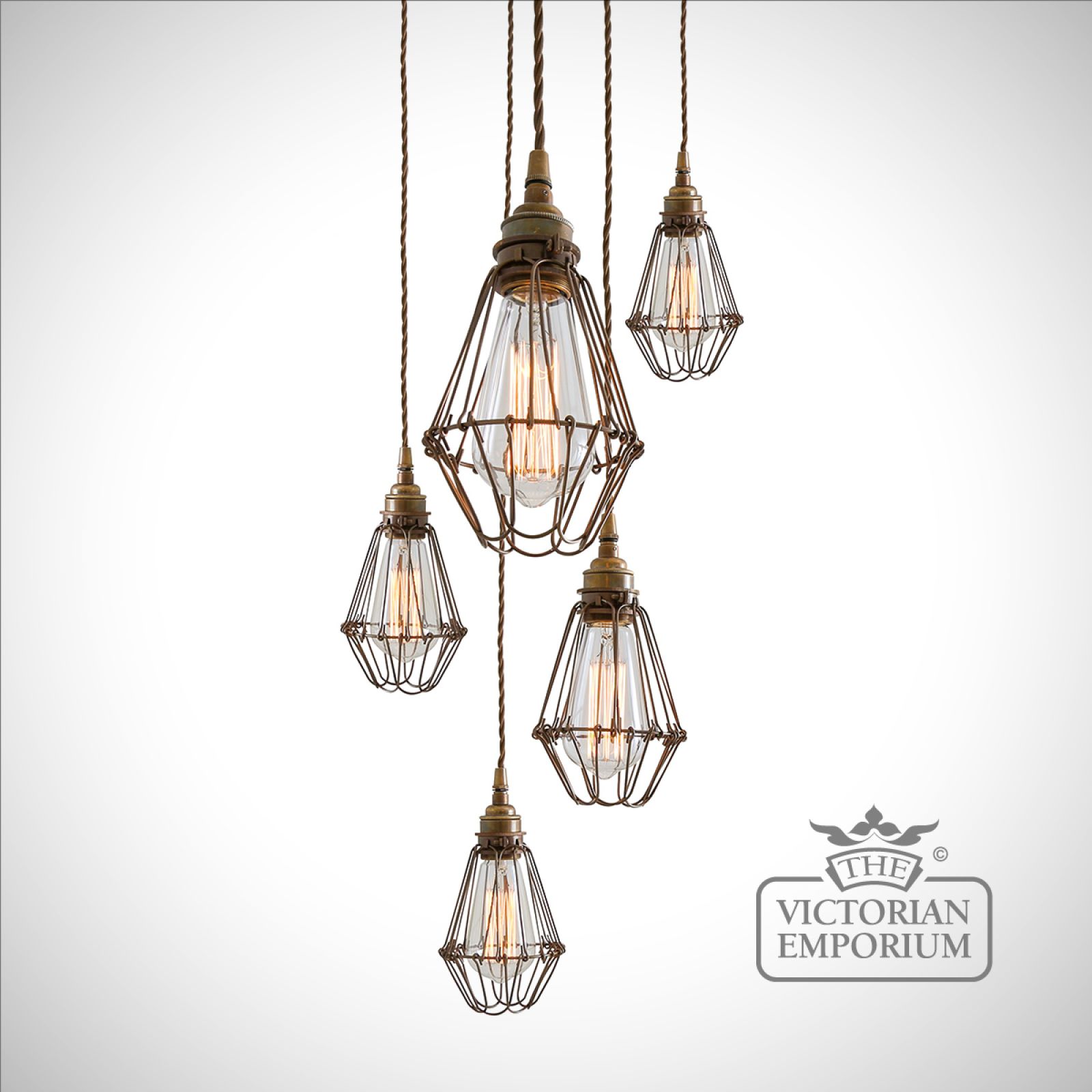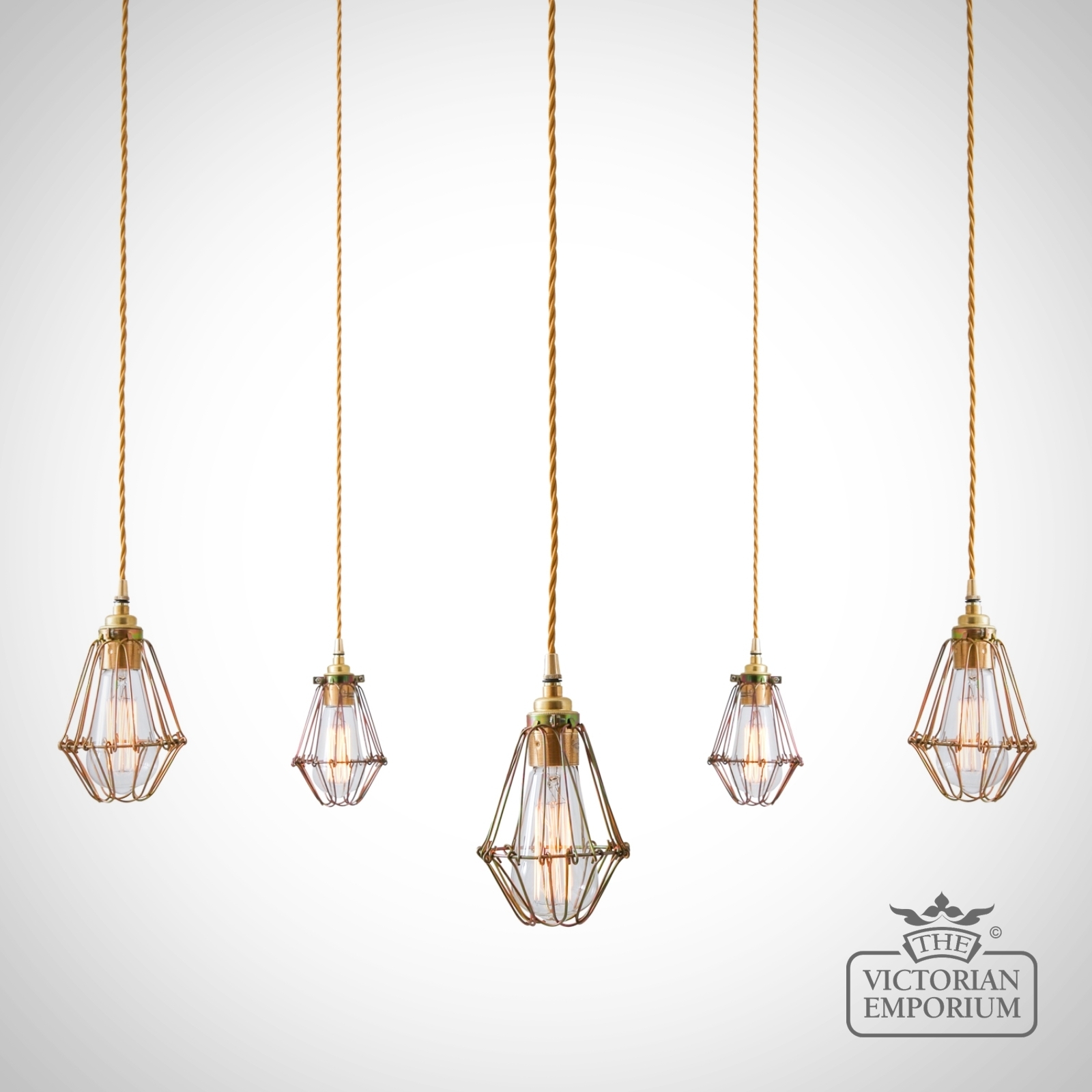 With the adjustable opening at the bottom of the cage, and the adjustable ceiling hooks, this cage pendant light can be altered easily to suit your own preference. Comes as standard with 5 suspensions from one ceiling rose. Additional or less suspensions can be provided on request.