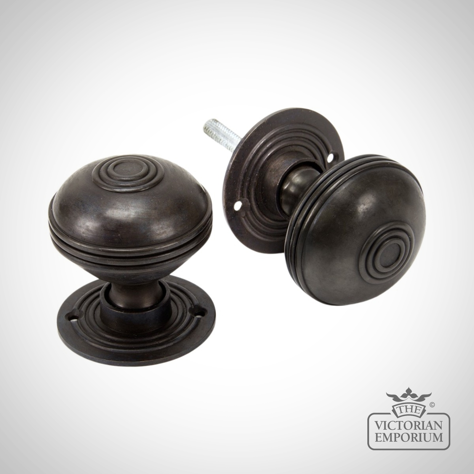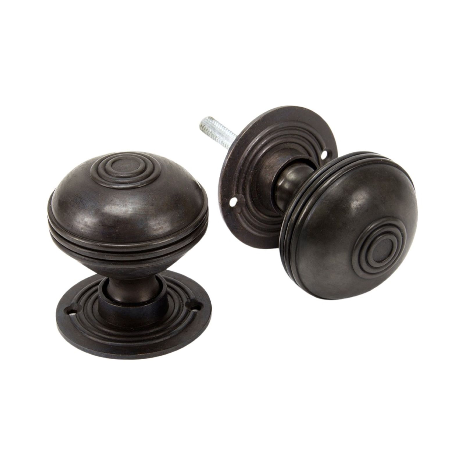 A solid pair of handcrafted door knobs in aged bronze in a choice of two sizes