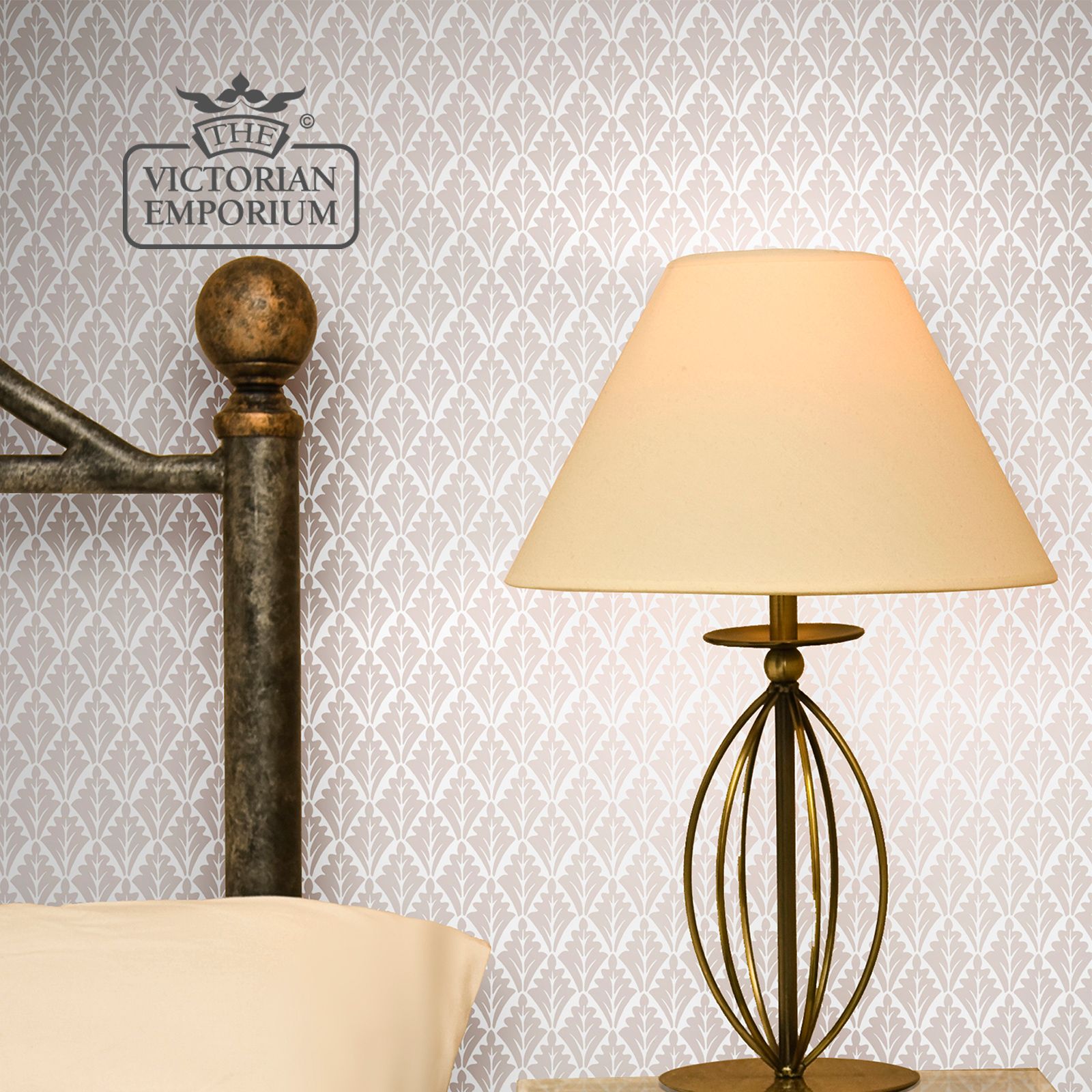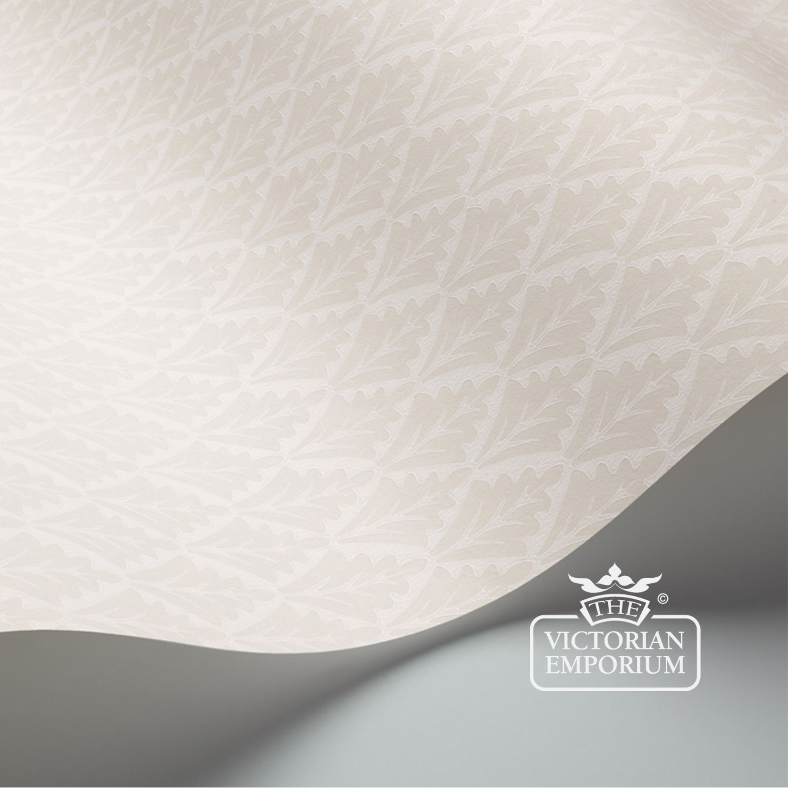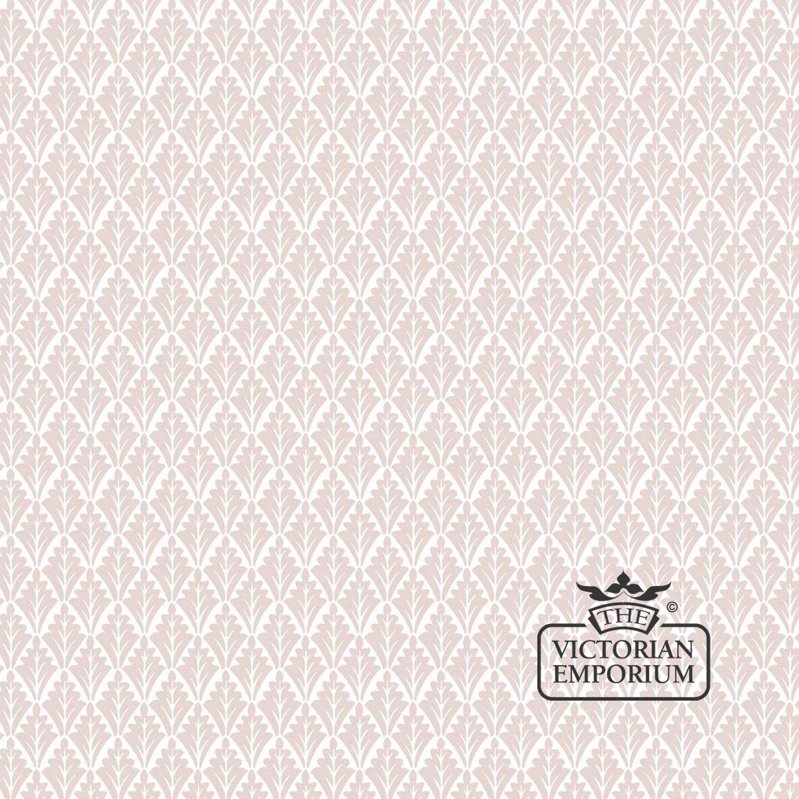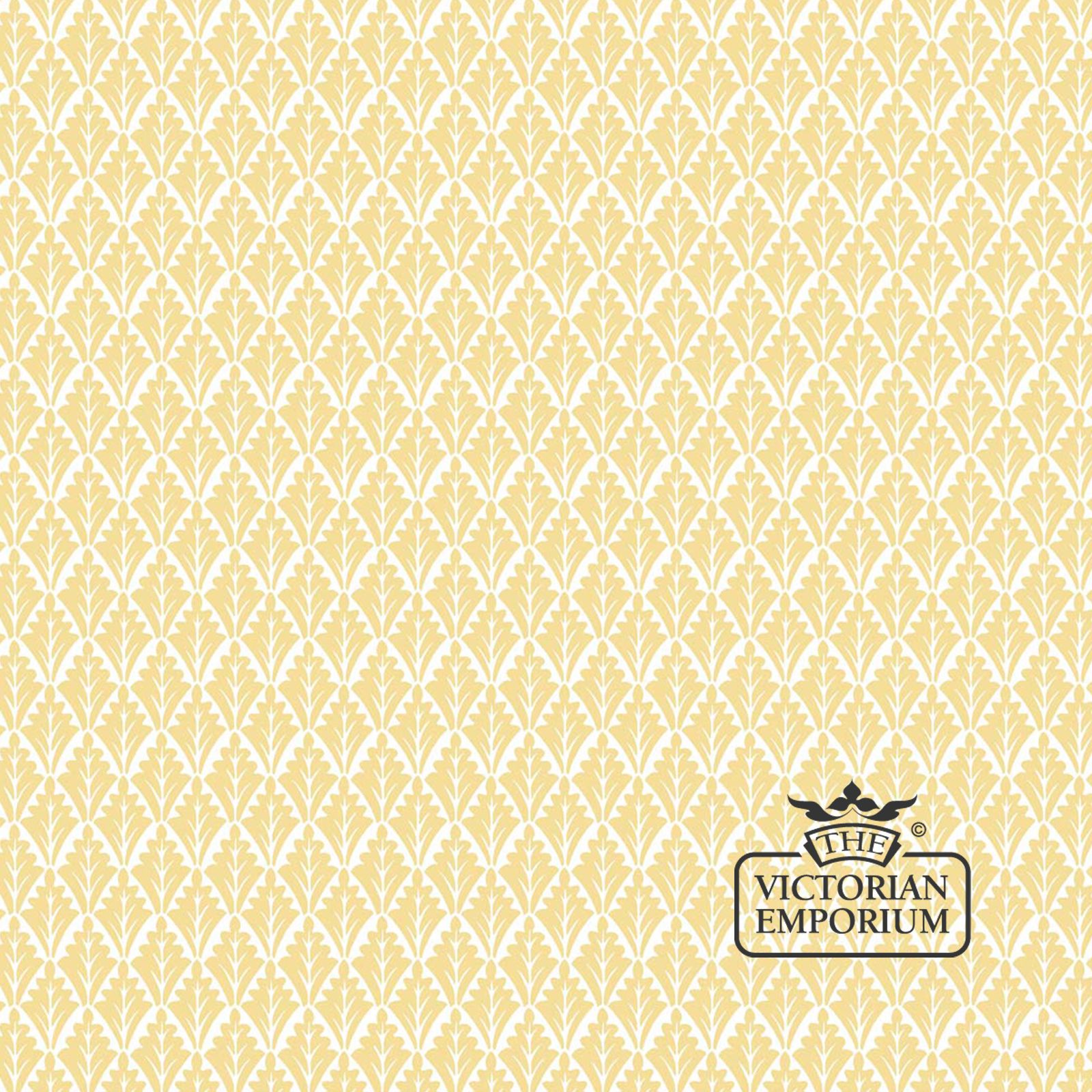 A small-scale early Victorian wallpaper design with pretty gothic overtones. This single colour surface print wallpaper pattern is offered in white on soft ochre, off white on pale grey, old magenta on red, off white on lilac.