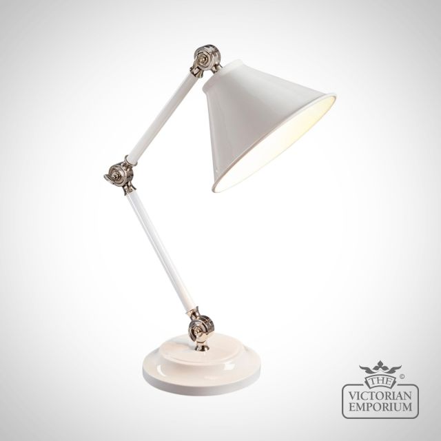This is a compact table lamp with a metallic highlight in White/Polished Nickel. Choice of 3 finishes: Black/Polished Brass, Dark Grey/Aged Brass and White/Polished Nickel