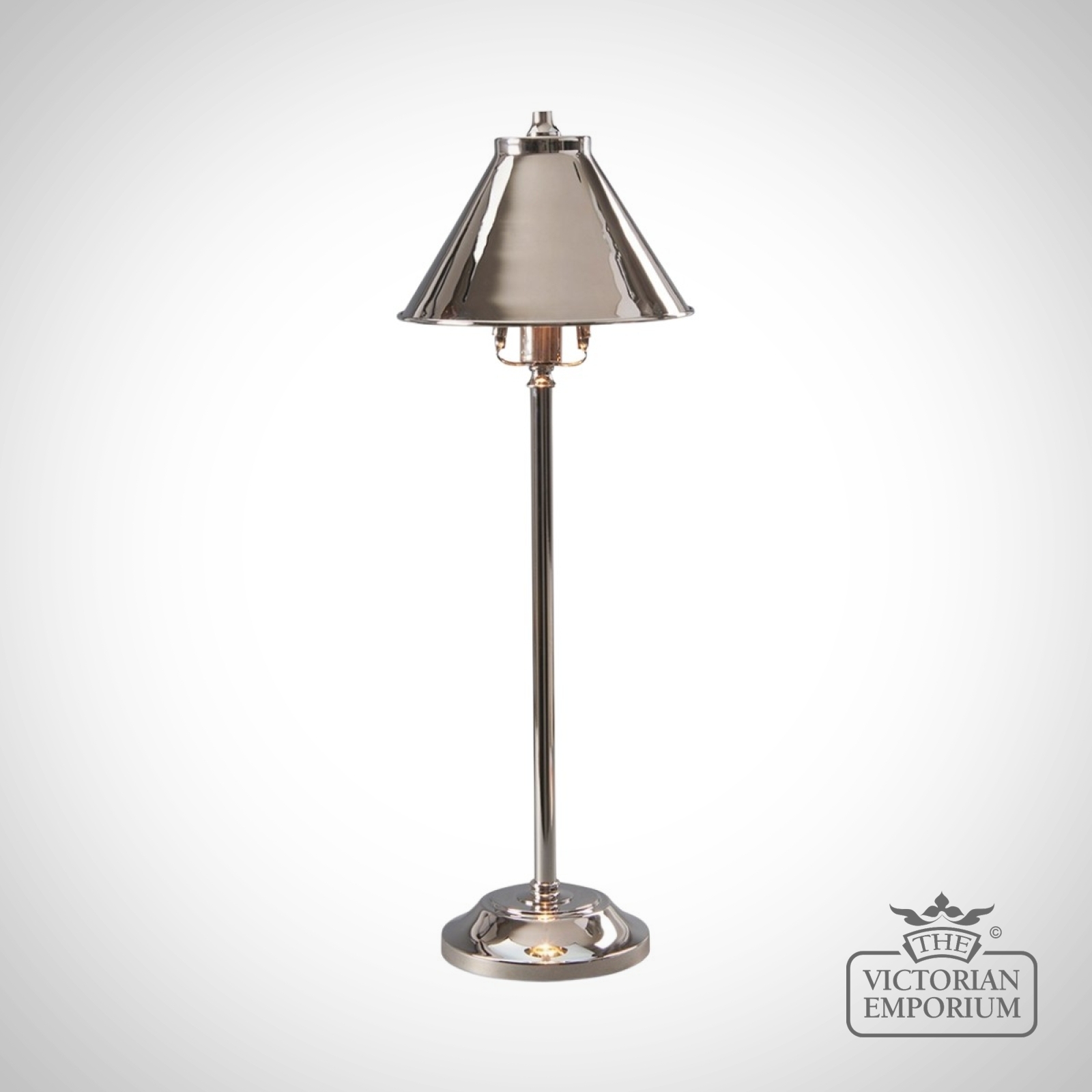 Simple task or buffet lamp, perfect on a desk or bedside table, in Polished Nickel. Choice of 4 finishes: Polished Copper, Aged Brass, Old Bronze and Polished Nickel