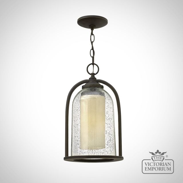 This chain lantern would make a stunning porch light with its bell-shaped design in die cast aluminium construction and seedy outer glass and interior etched opal cylinder, acting as a “faux” candle