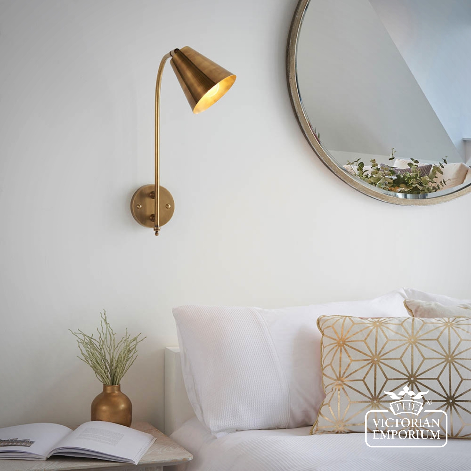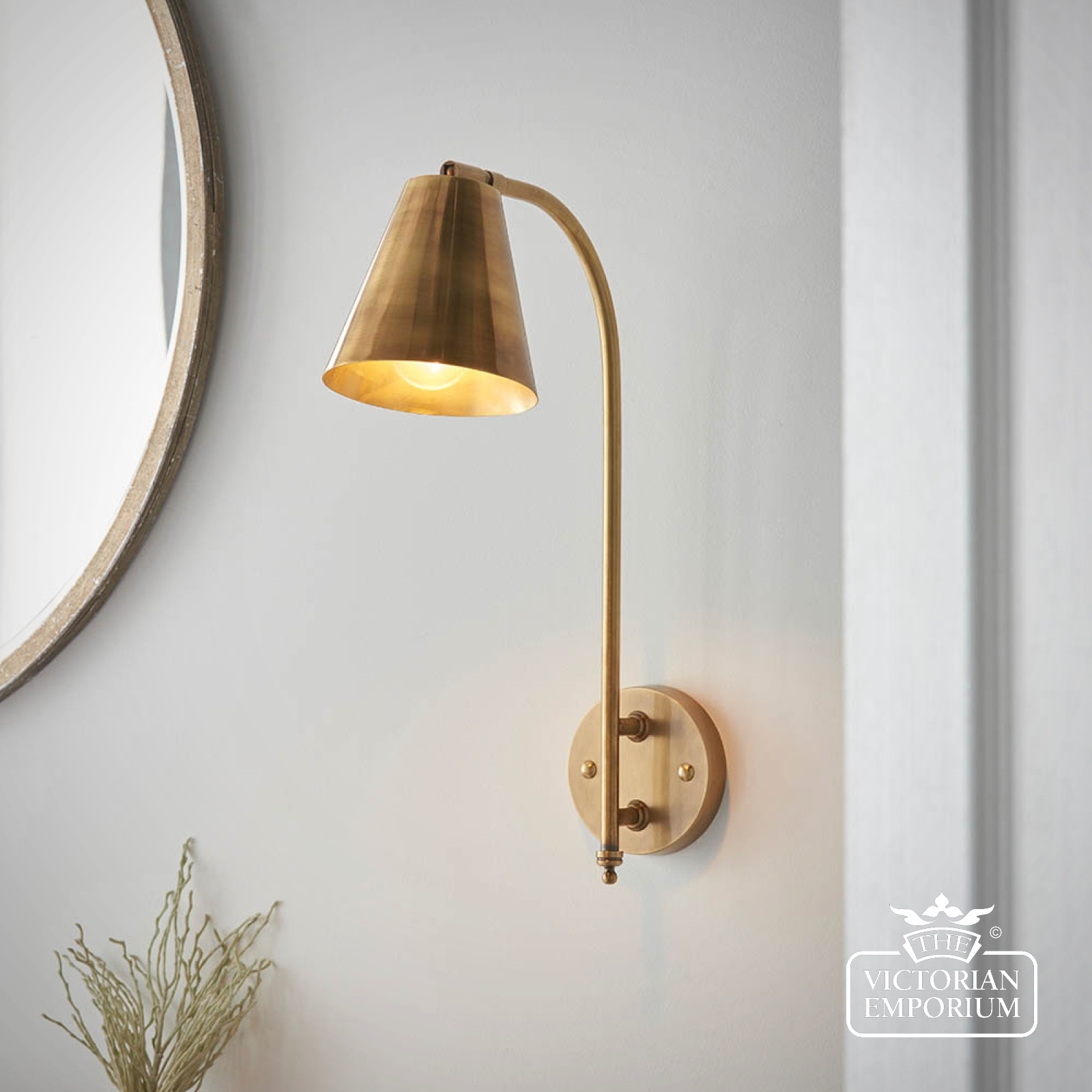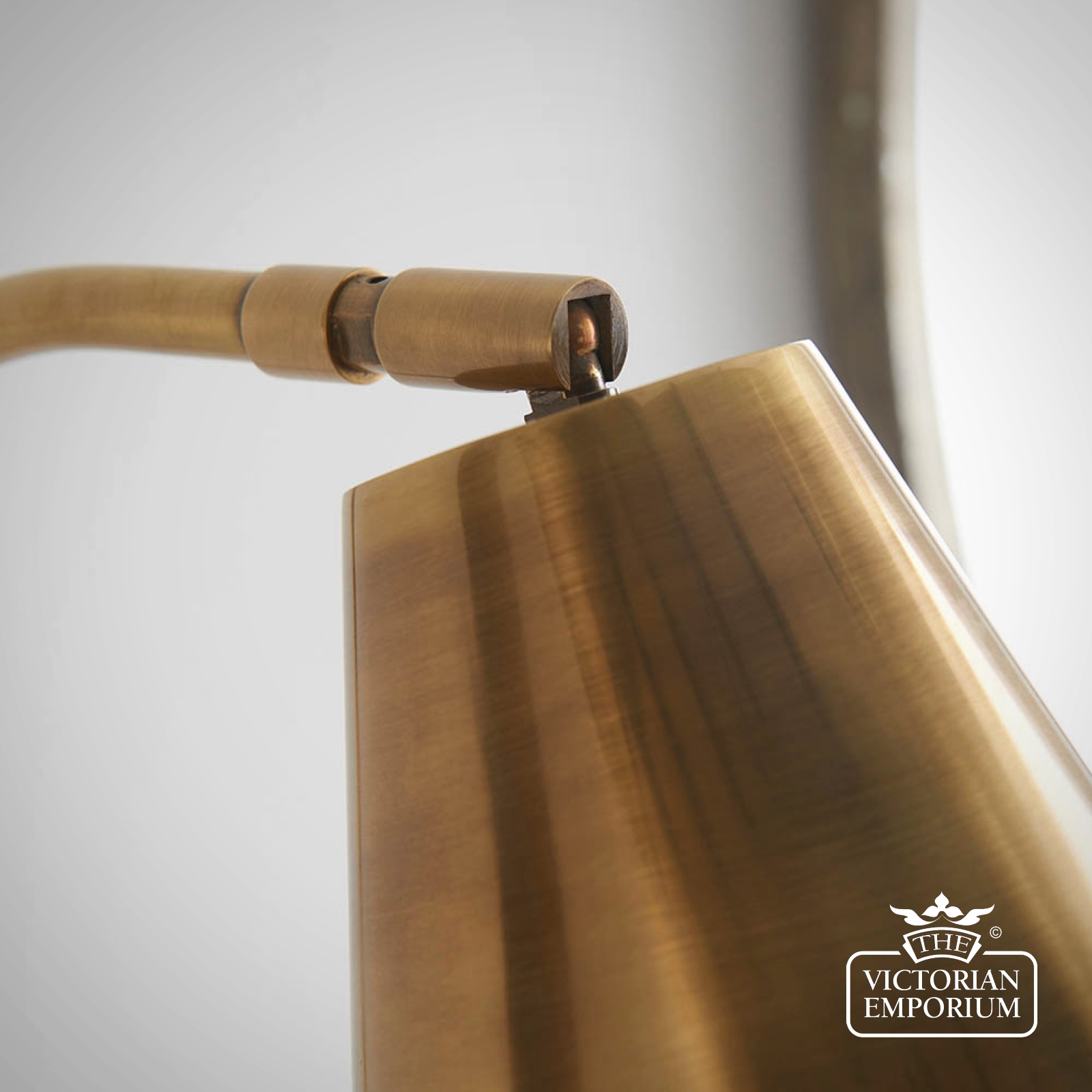 A beautiful wall light to position either side of your bed or as a task light above a kitchen work top. This wall light constructed in brass with an authentic antique finish, with a directional shade and classic design details.