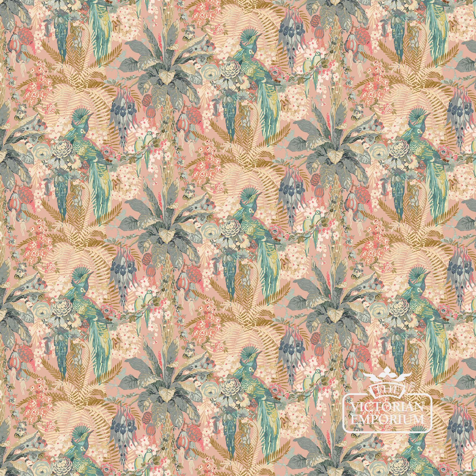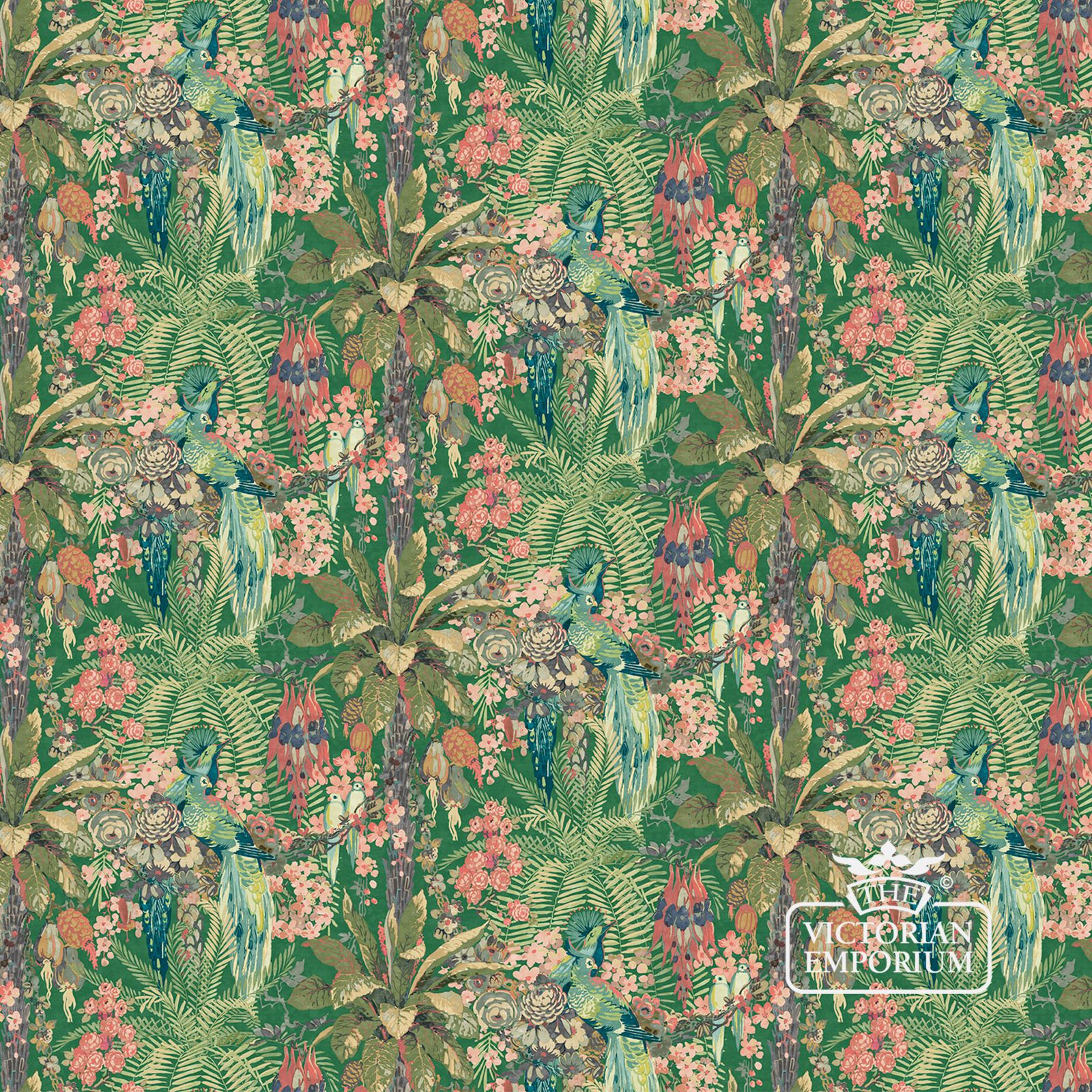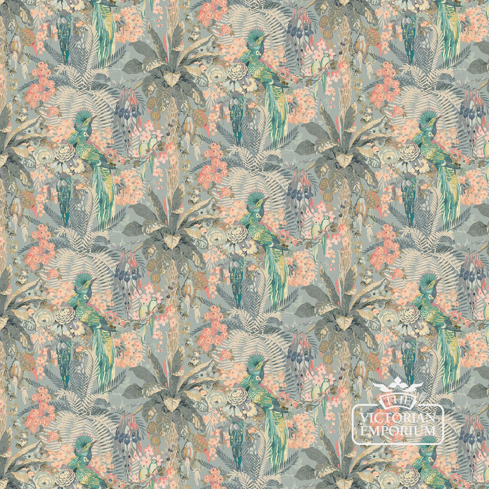 Tropical plants and exotic birds form an explosive and colourful design. Available in Powder Blue, Candy or Deep greens this decorative wallpaper is based on a 1920s archival document.