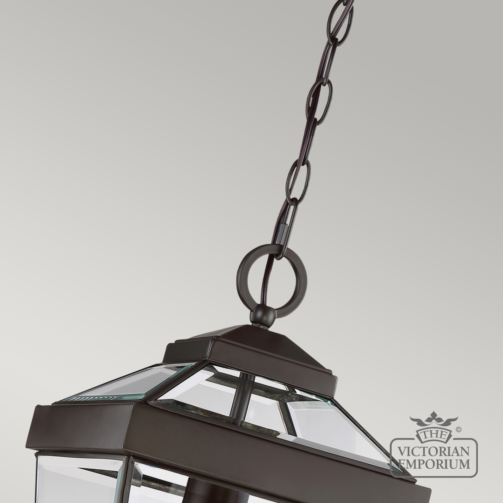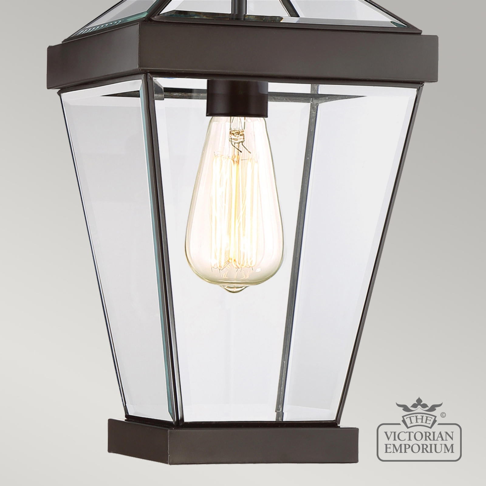 The Ravine outdoor collection in Western Bronze on the base showcases the clear bevelled glass panels on the sides and top of the fixture and is an elegant period style collection of outdoor lights.