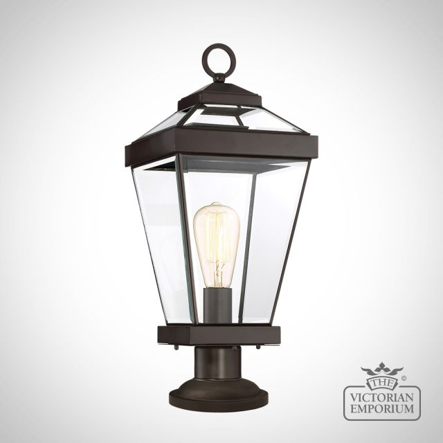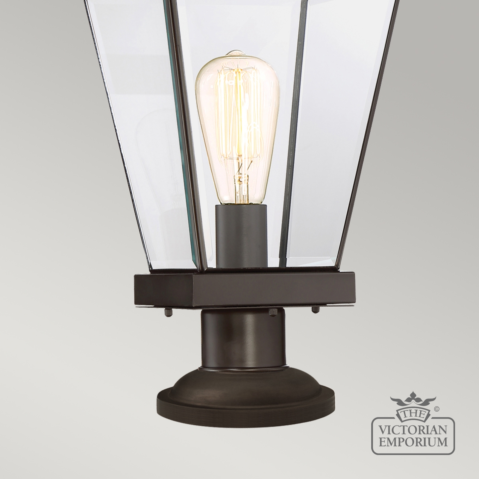 The Ravine outdoor collection in Western Bronze on the base showcases the clear bevelled glass panels on the sides and top of the fixture and is an elegant period style collection of outdoor lights.