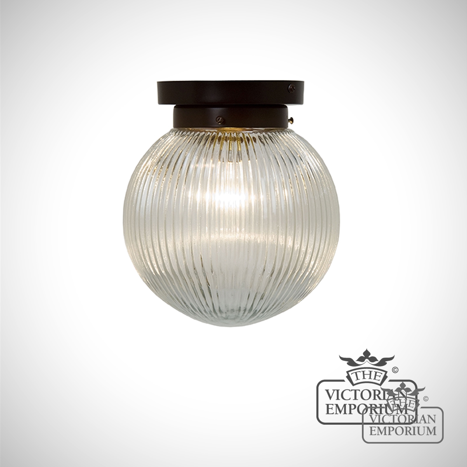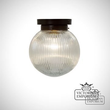 Reeded glass globe flush mount ceiling light with antique bronze metalwork