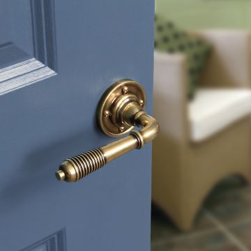 A classic Regency lever on a rose handle made from solid brass with a heavy moulding at its base. An attractive lever with double ogee ring and stylish reeded end.