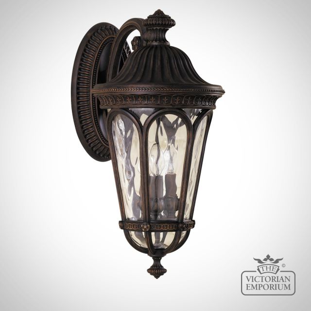 This regency style lantern boasts hand blown clear water glass and all die cast aluminium construction with a rich walnut finish