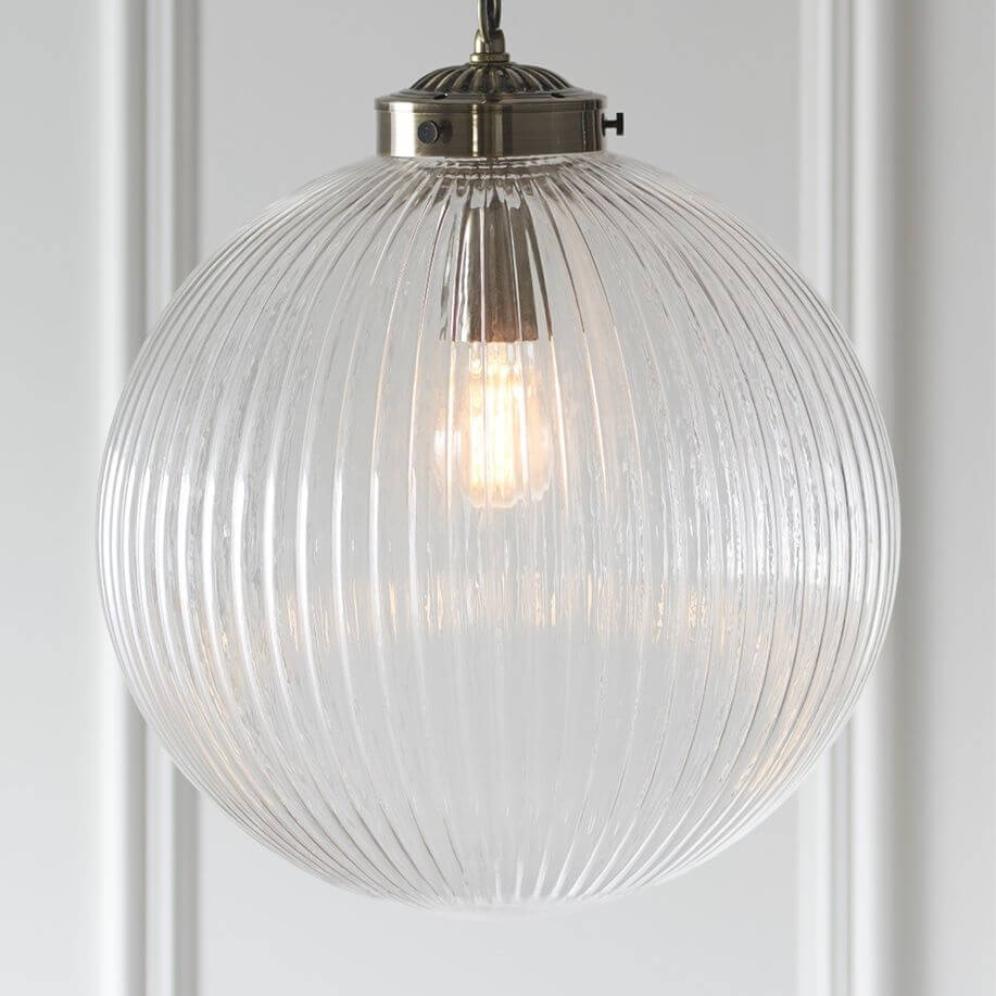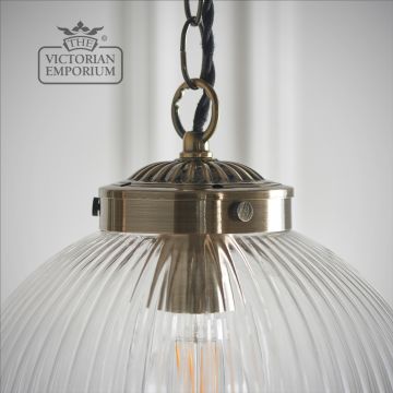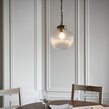 This is a classic Victorian style pendant featuring a ribbed glass globe and antique brass metalwork, perfect for kitchen lighting over a table or countertop. Available in a choice of globe sizes.