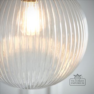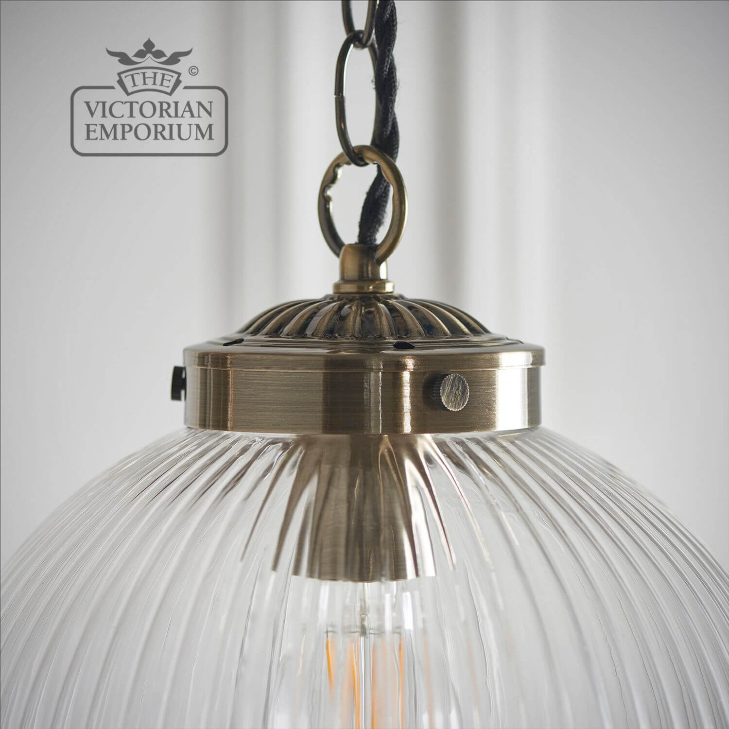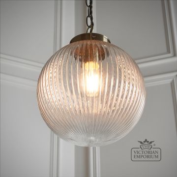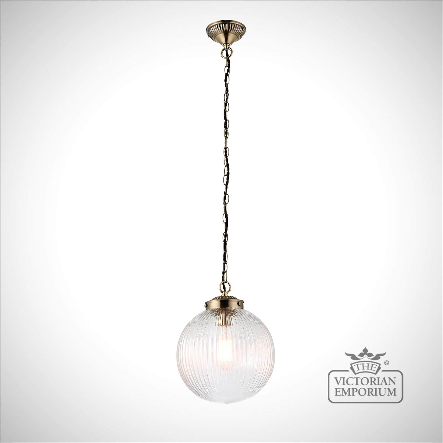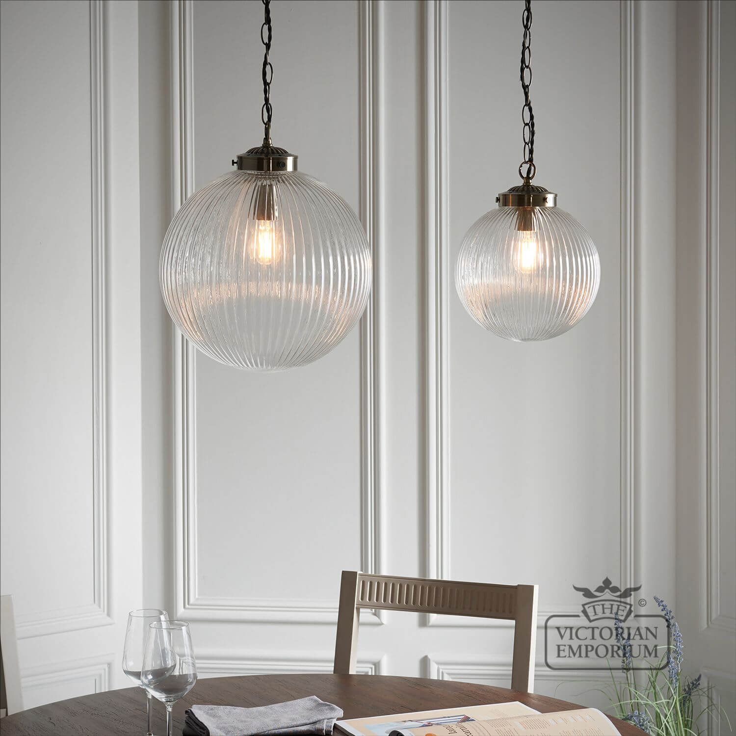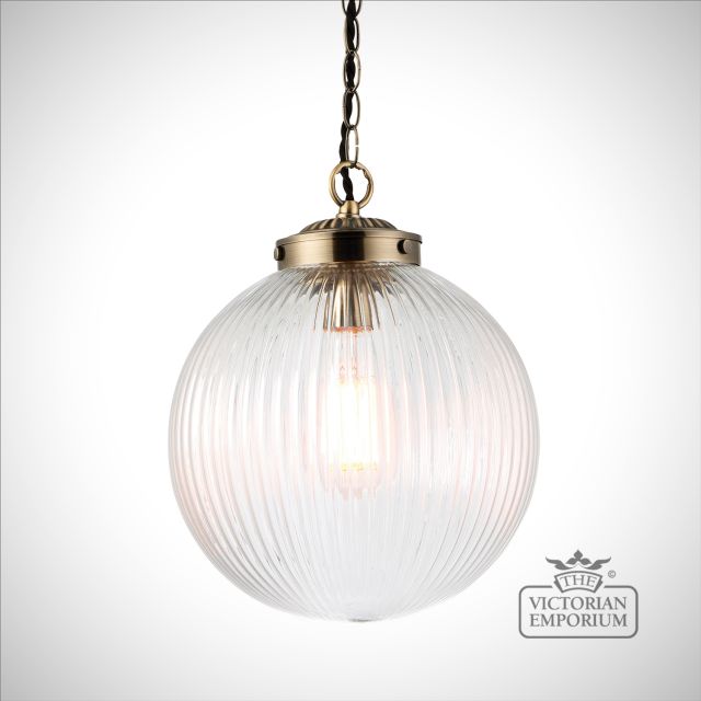 Classic Victorian style pendant featuring a ribbed glass globe and antique brass metalwork. Available in a choice of globe sizes