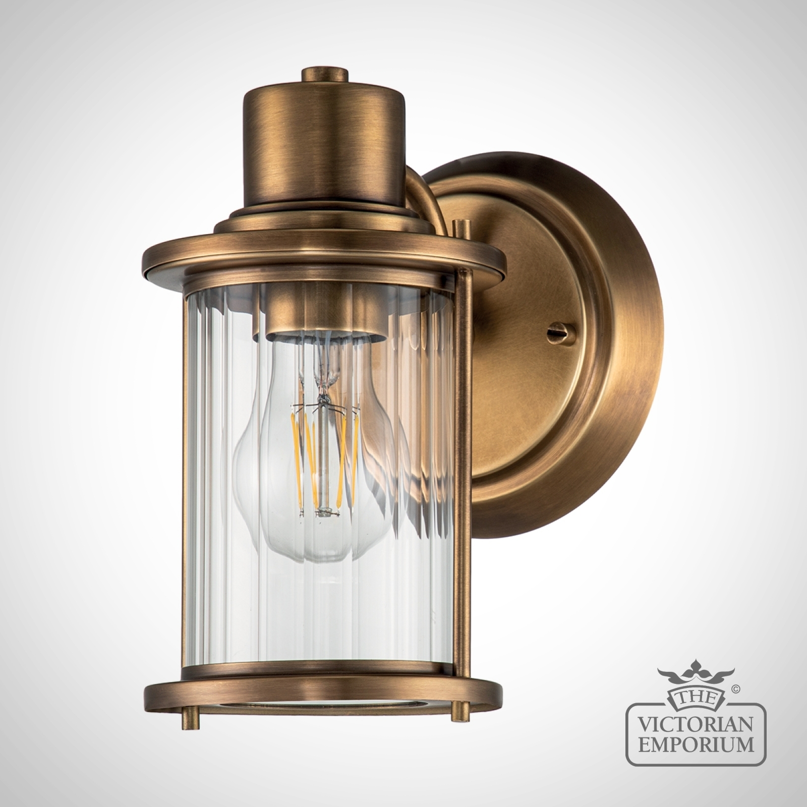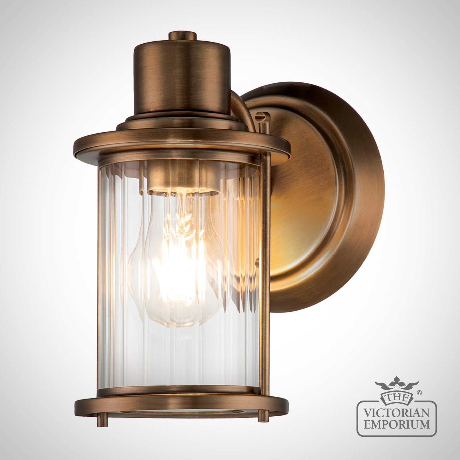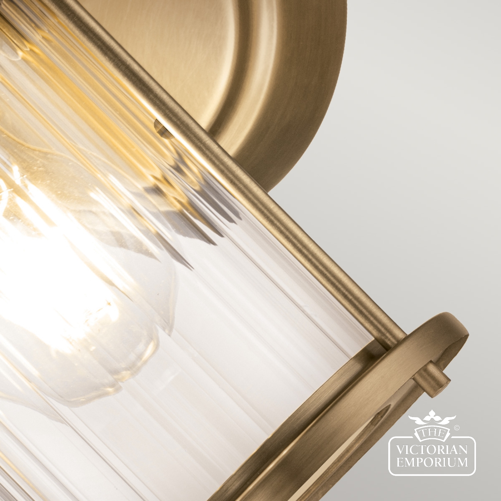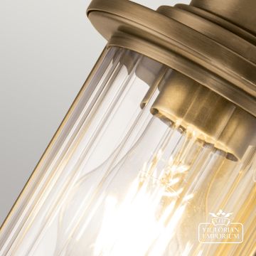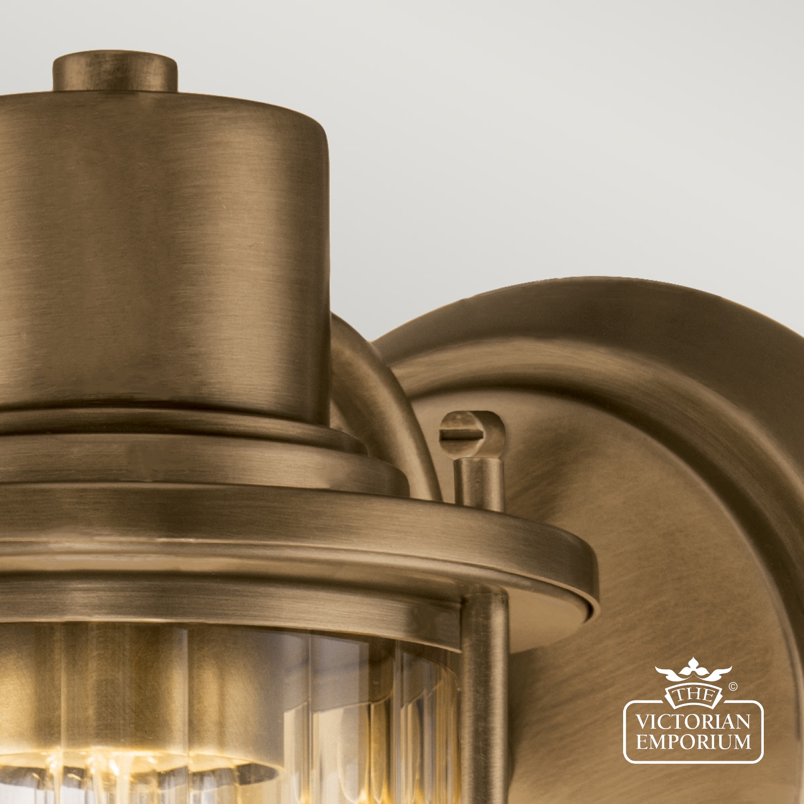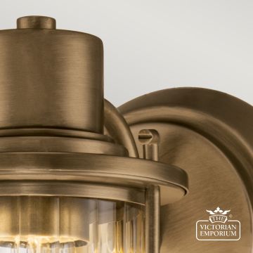Riggs Single Wall Light is finished in Weathered Brass, with clear ribbed glass. It has a light industrial look and is IP44 bathroom rated and is an excellent choice for period bathrooms.