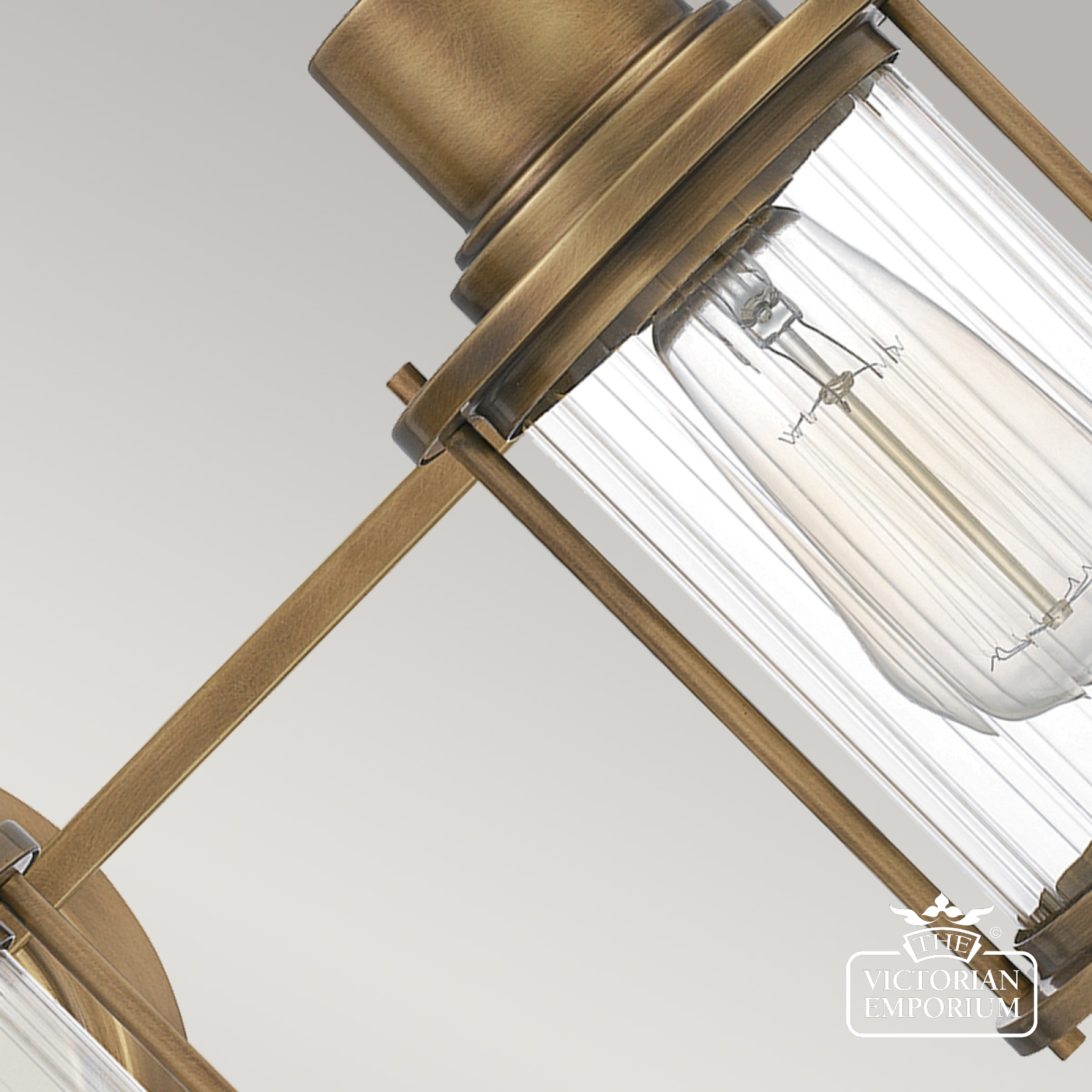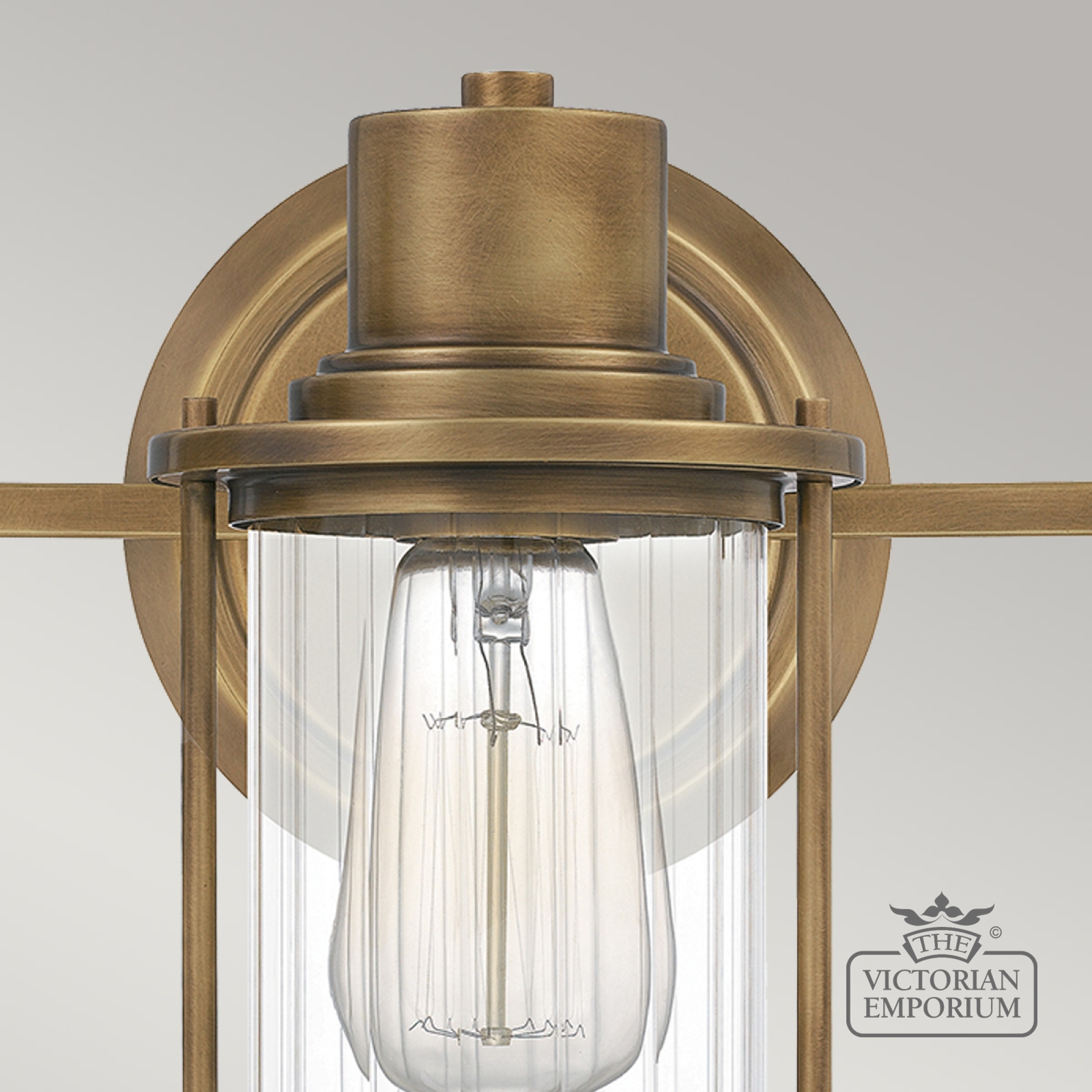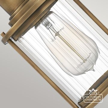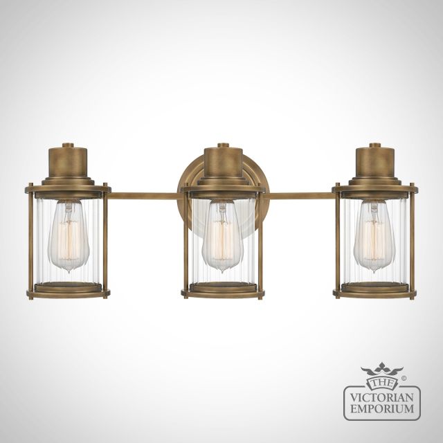 Riggs Triple Wall Light is finished in Weathered Brass, with clear ribbed glass. It has a light industrial look and is IP44 bathroom rated and is an excellent choice for period bathrooms.