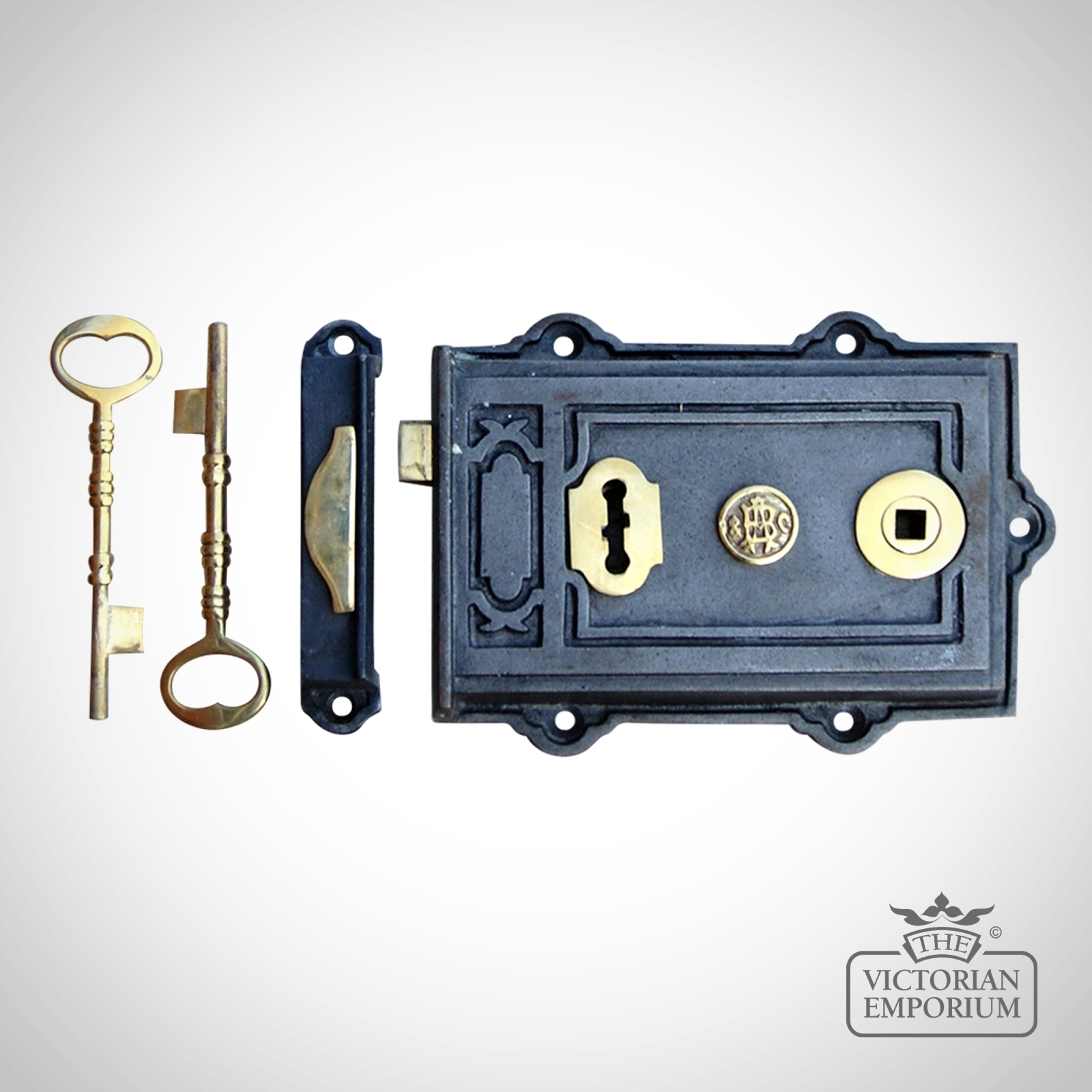 Really beautiful decorative ornate Cast Iron and brass rim lock - a really eye catching addition to any period door