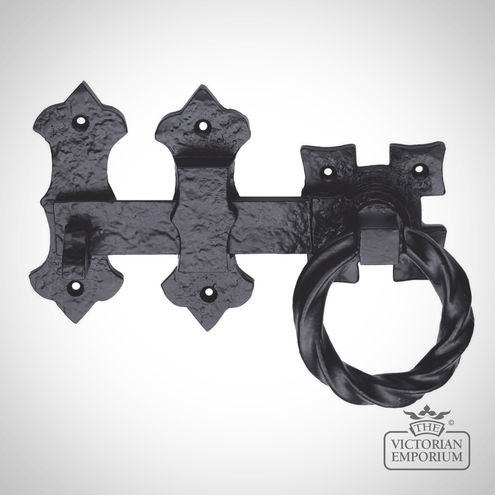 Black Antique basic ring handle gate latch in a very traditional style. When the ring handle is lifted and turned this raises the latch bar from its keep allowing the gate to open.