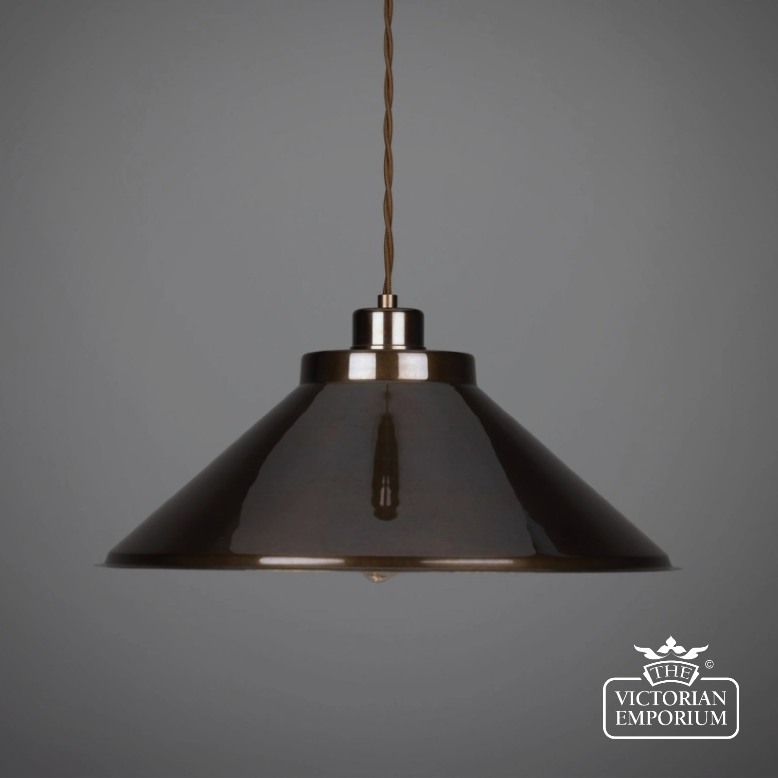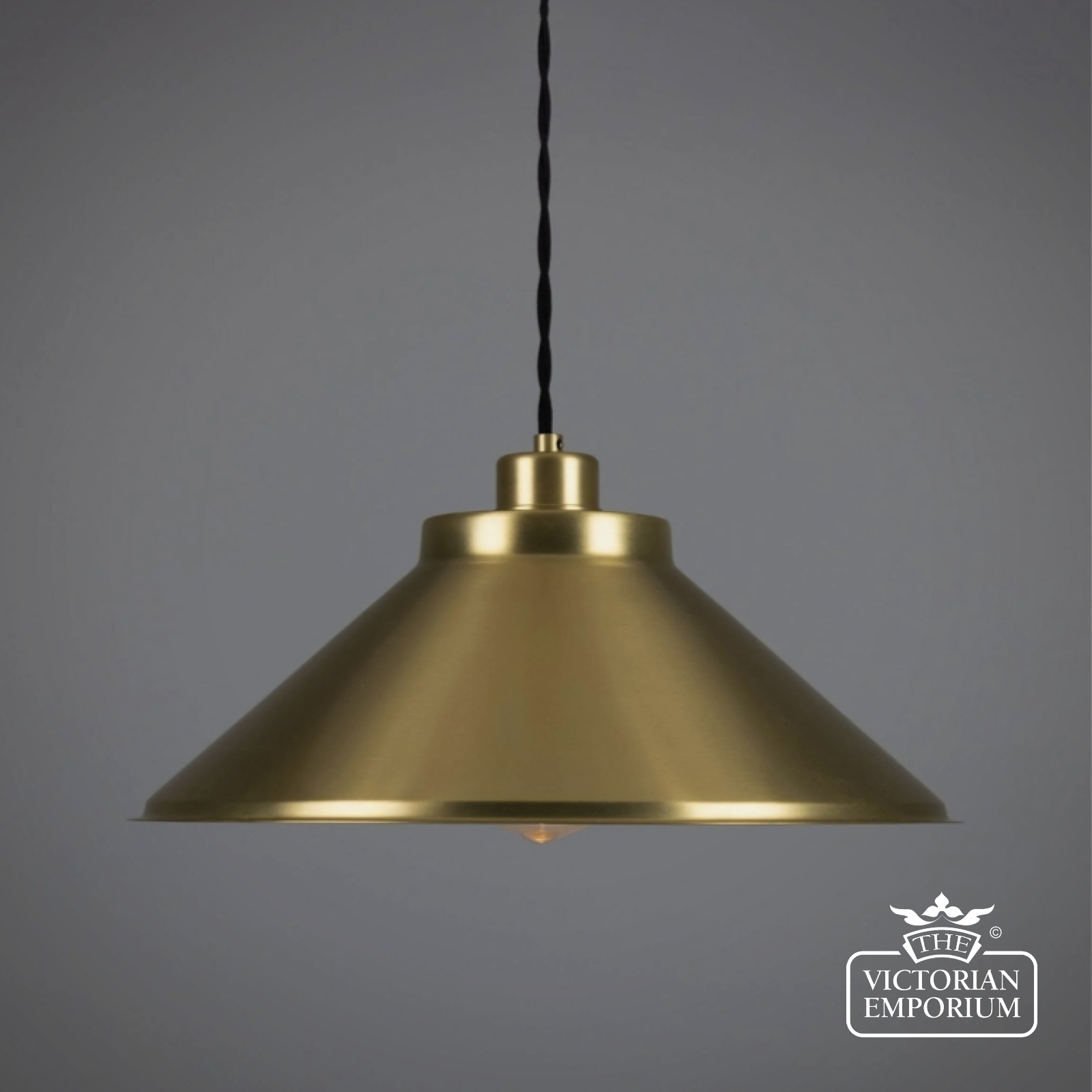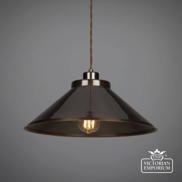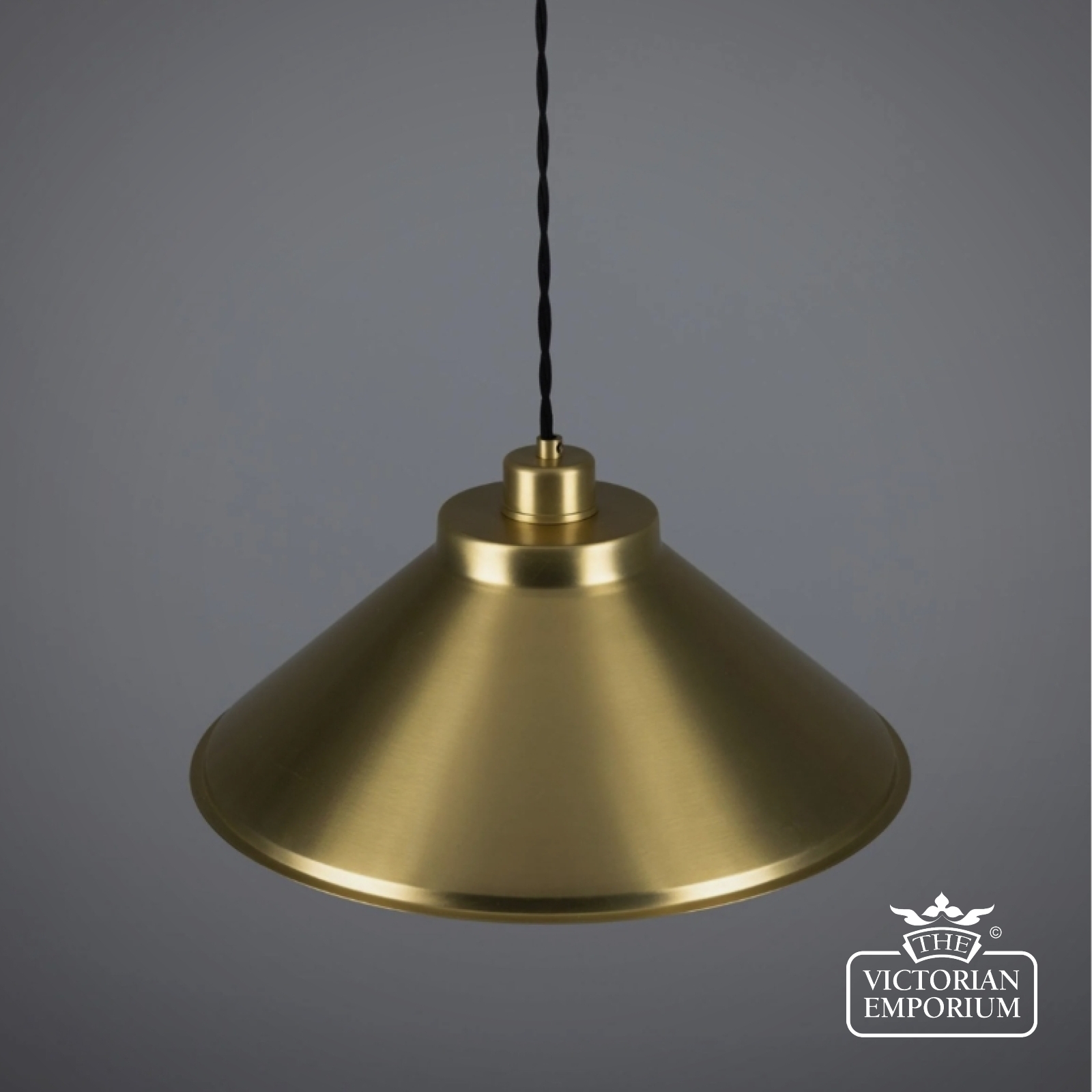 The Rios pendant light is a simple vintage pendant light with a matching brass ceiling rose with black, braided cable secured to a brass lamp holder using a cord grip.