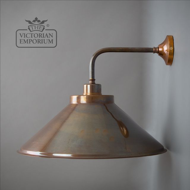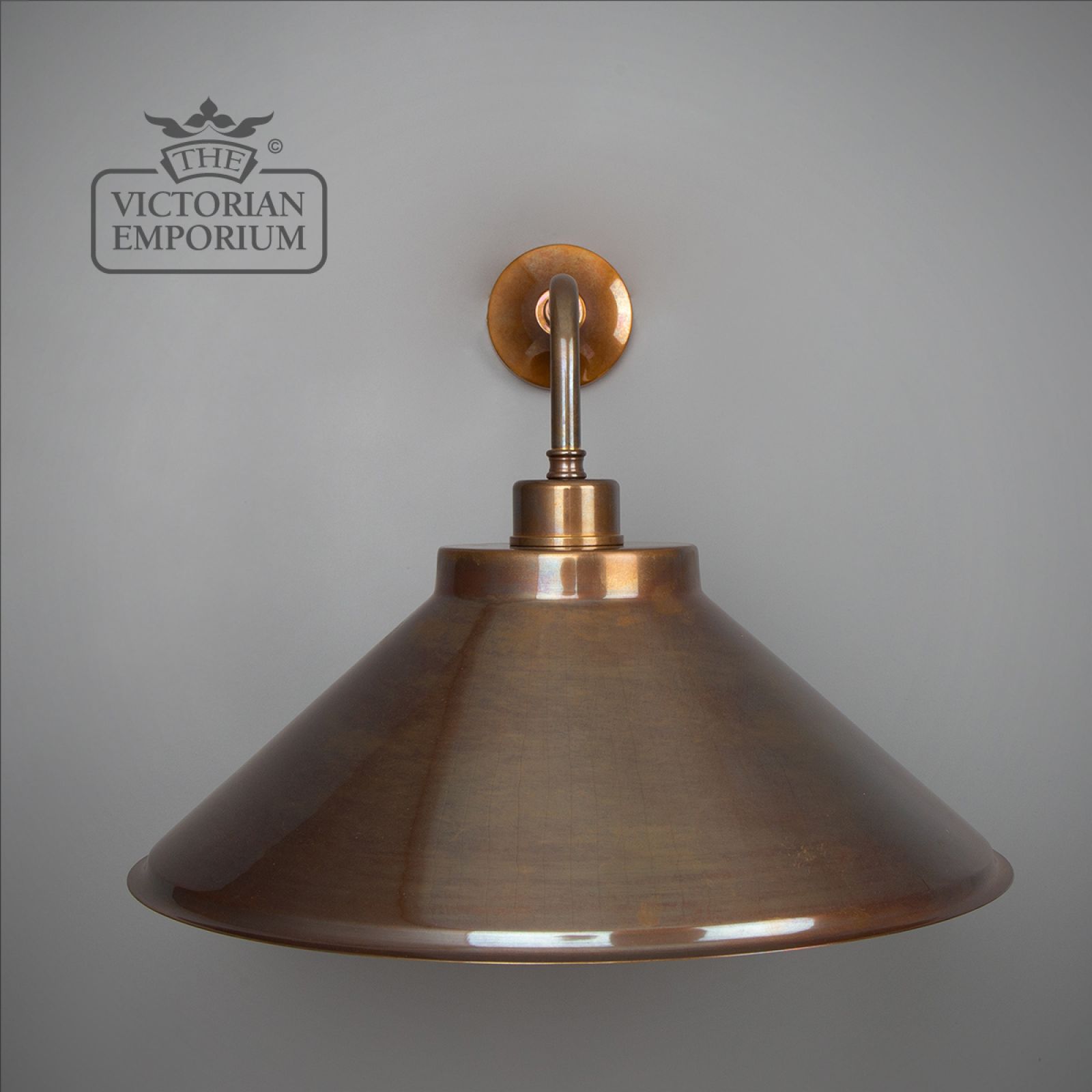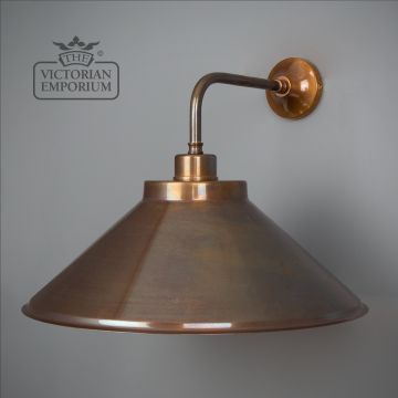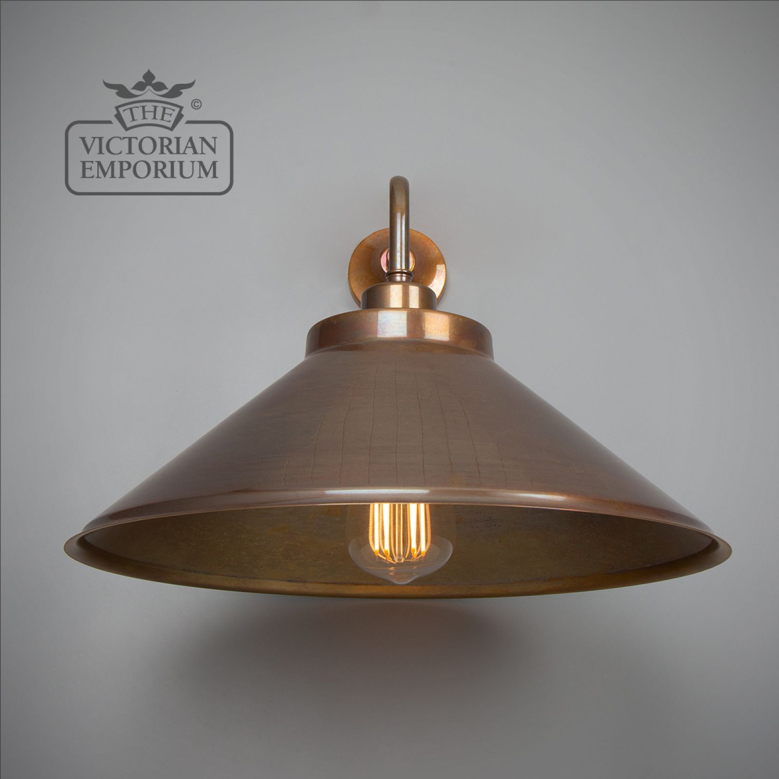 The Rios wall light is a wall light with a simple, vintage style shade featuring a small brass wall plate with a right angled arm holding the brass shade. This classic wall light would suit living rooms and hallways, restaurants and pubs.