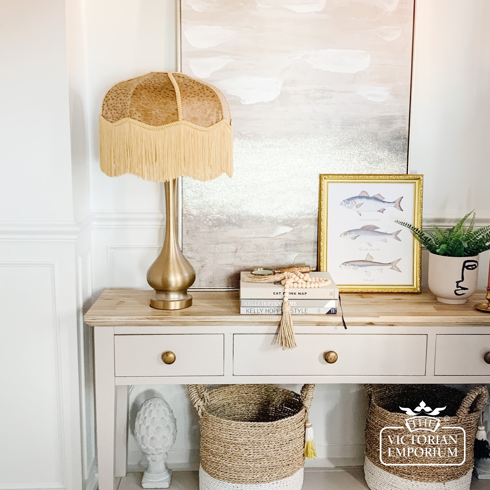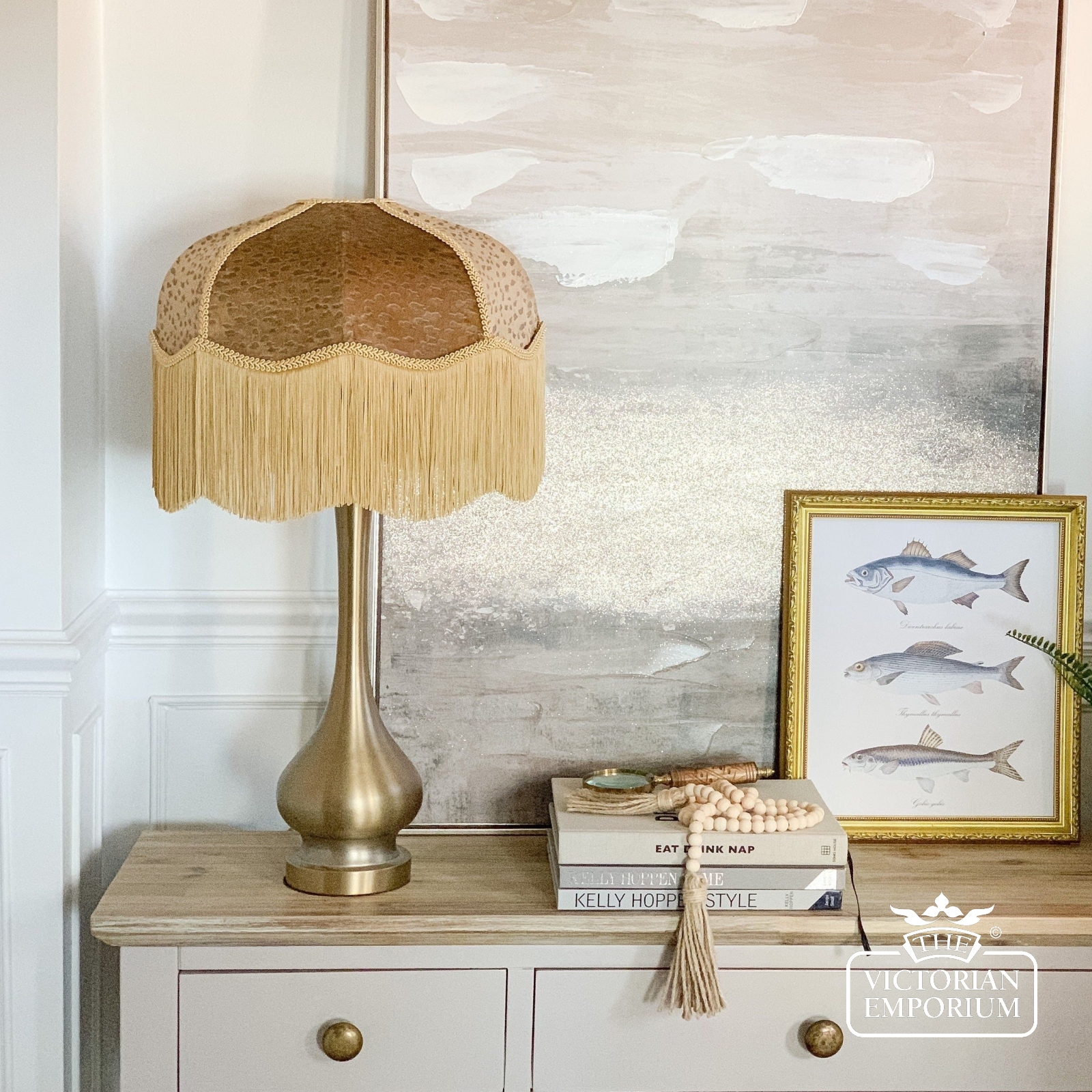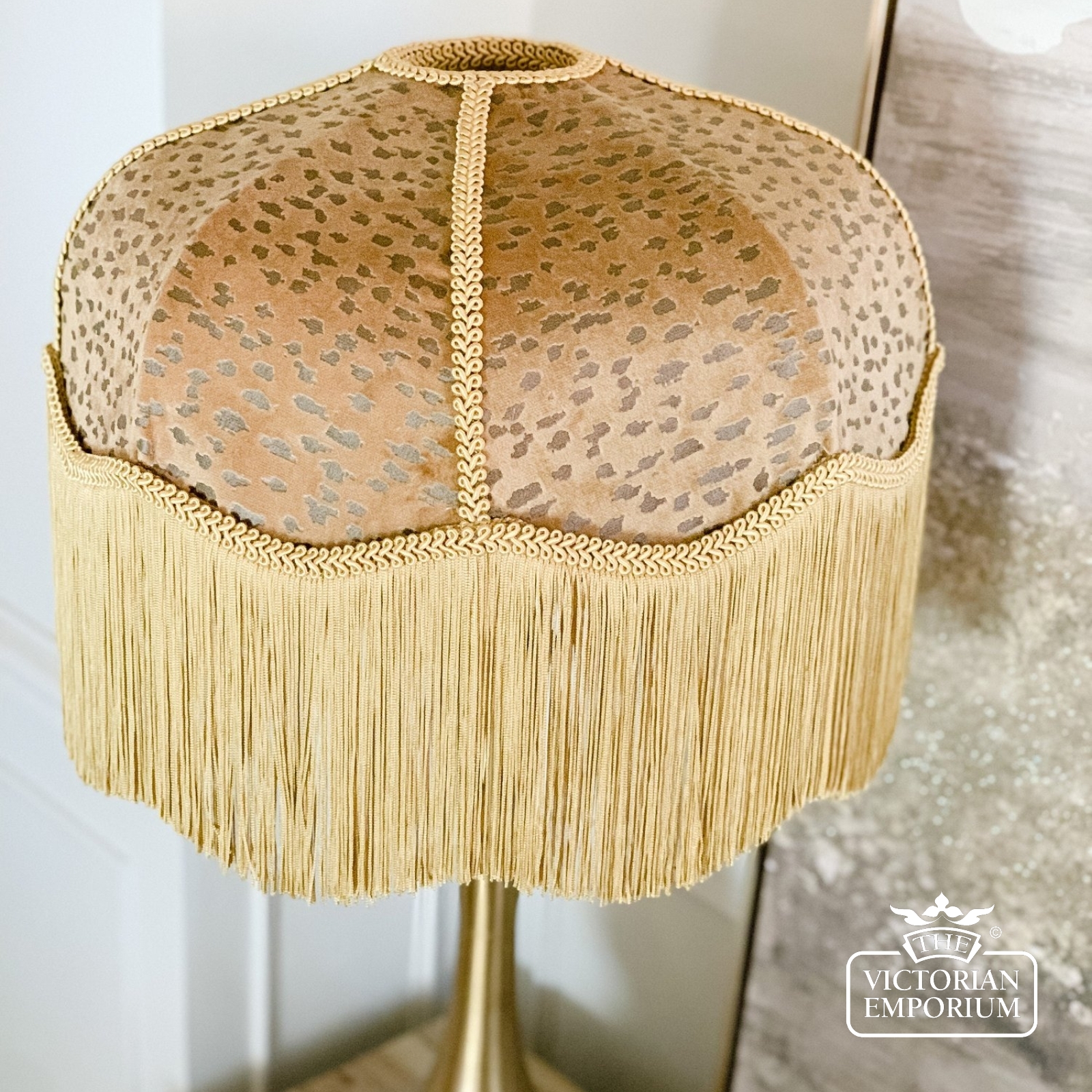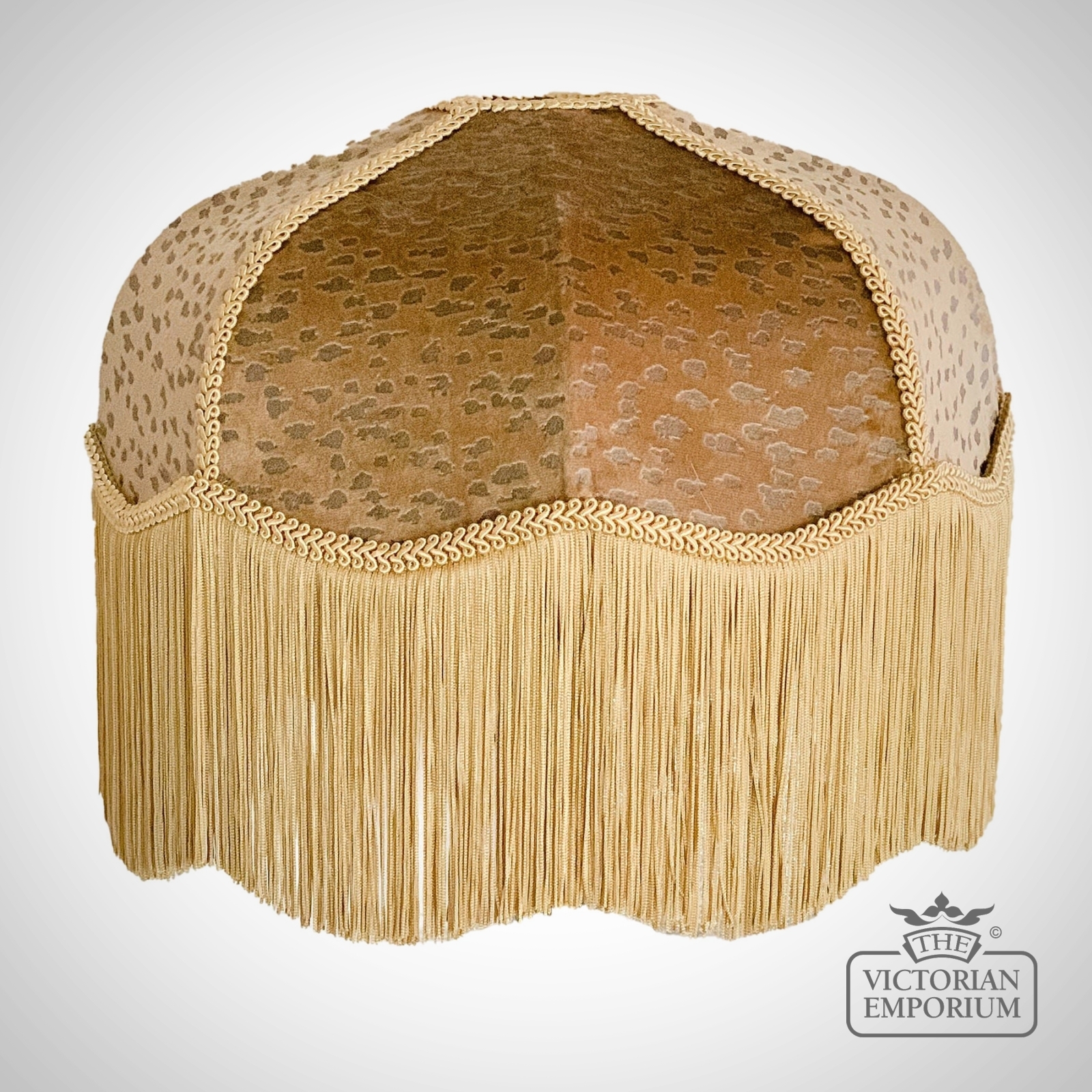 This is a beautiful Victorian Style lamp shade with a gold velvet body and matching fringing that can be purchased in a choice of sizes so that you can use it for table lamps, standing lamps, wall lights and ceiling lights around your period home