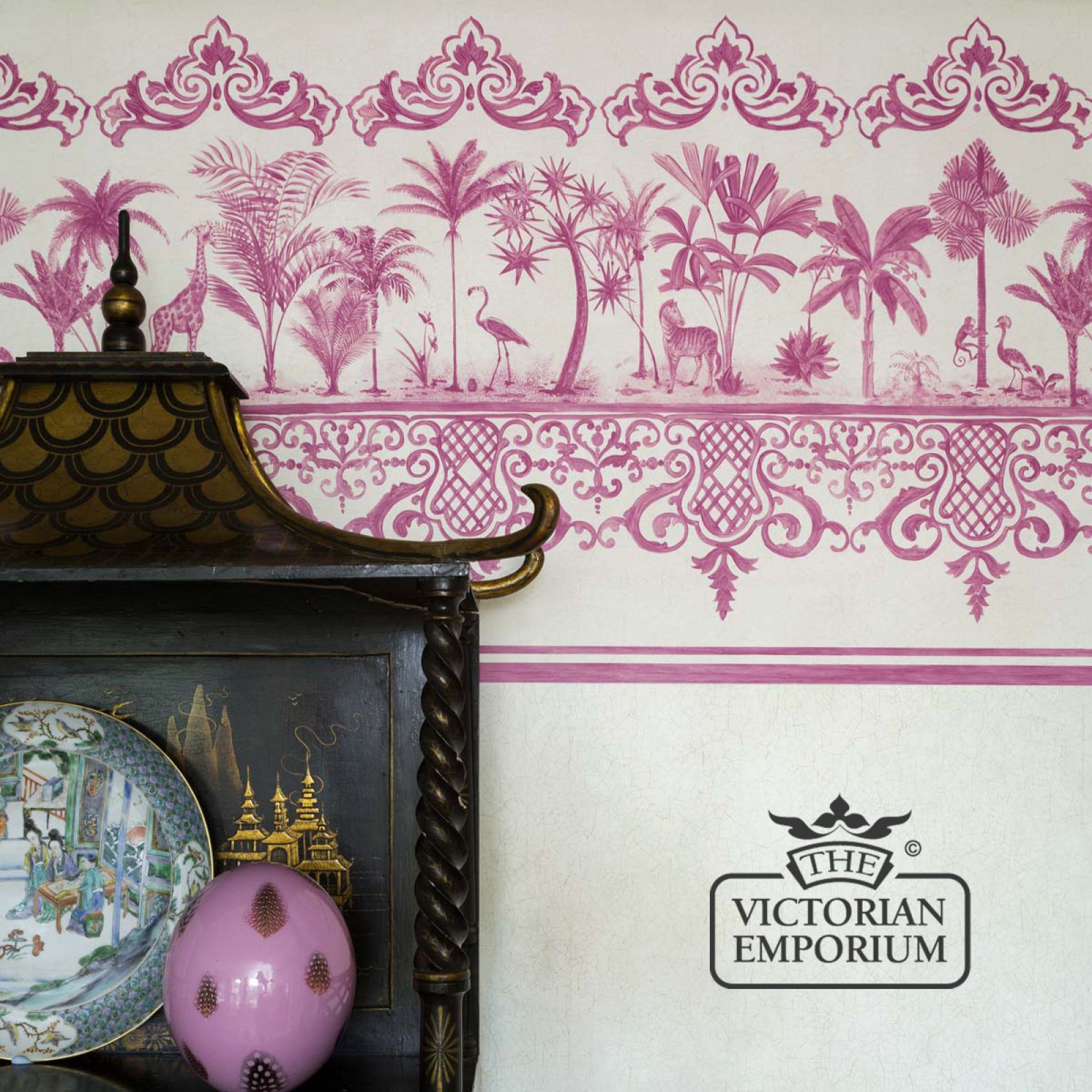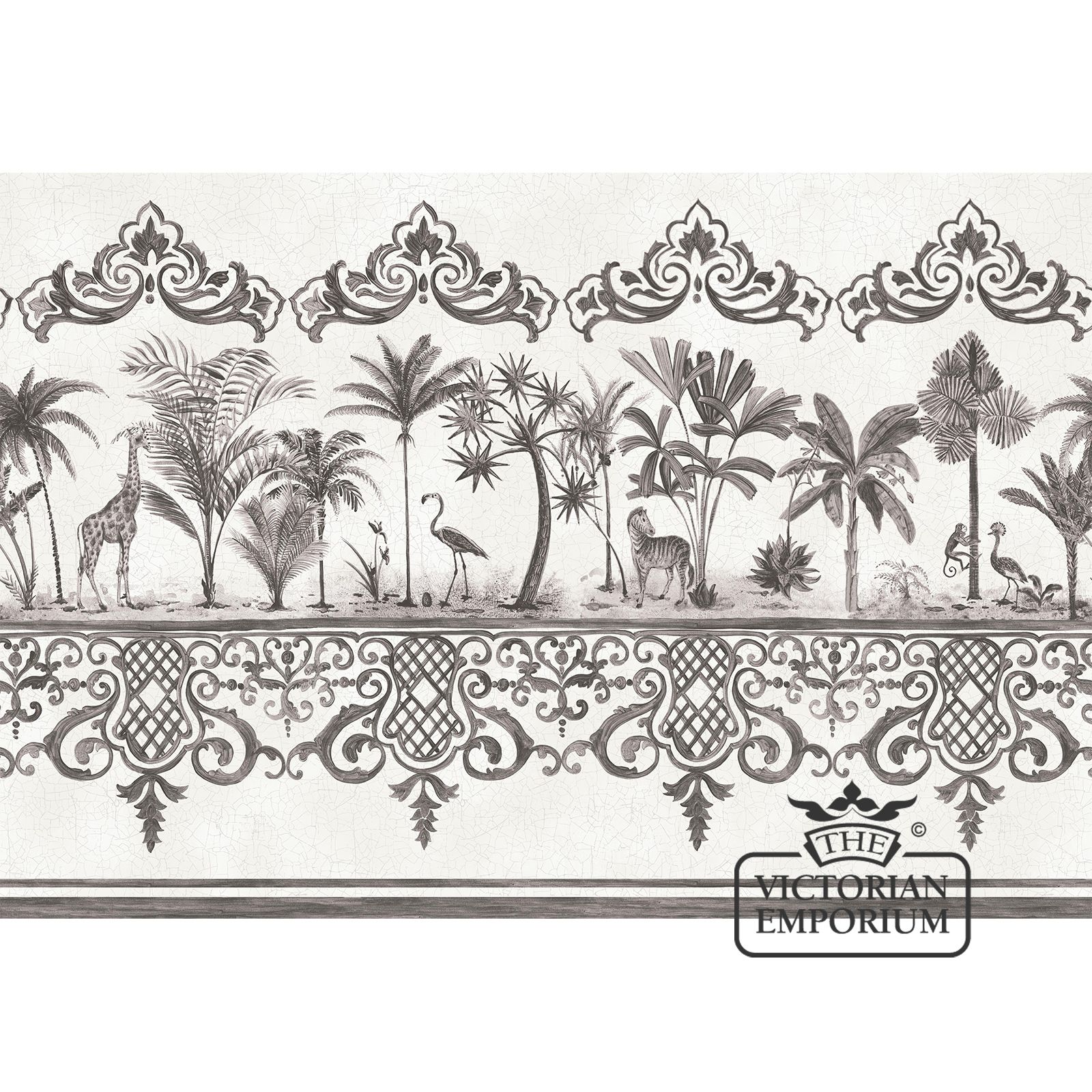 An elegant frieze designed to co-ordinate directly with the wallpaper of the same name. Featuring painted scenes of exotic palm trees and animals on a delicate craquelure ground.