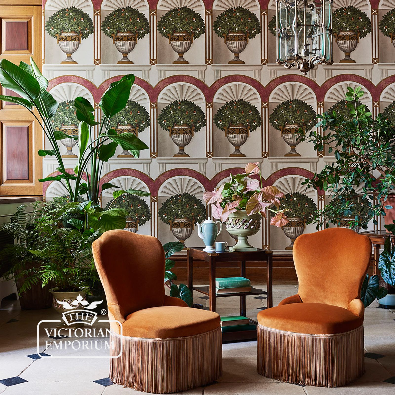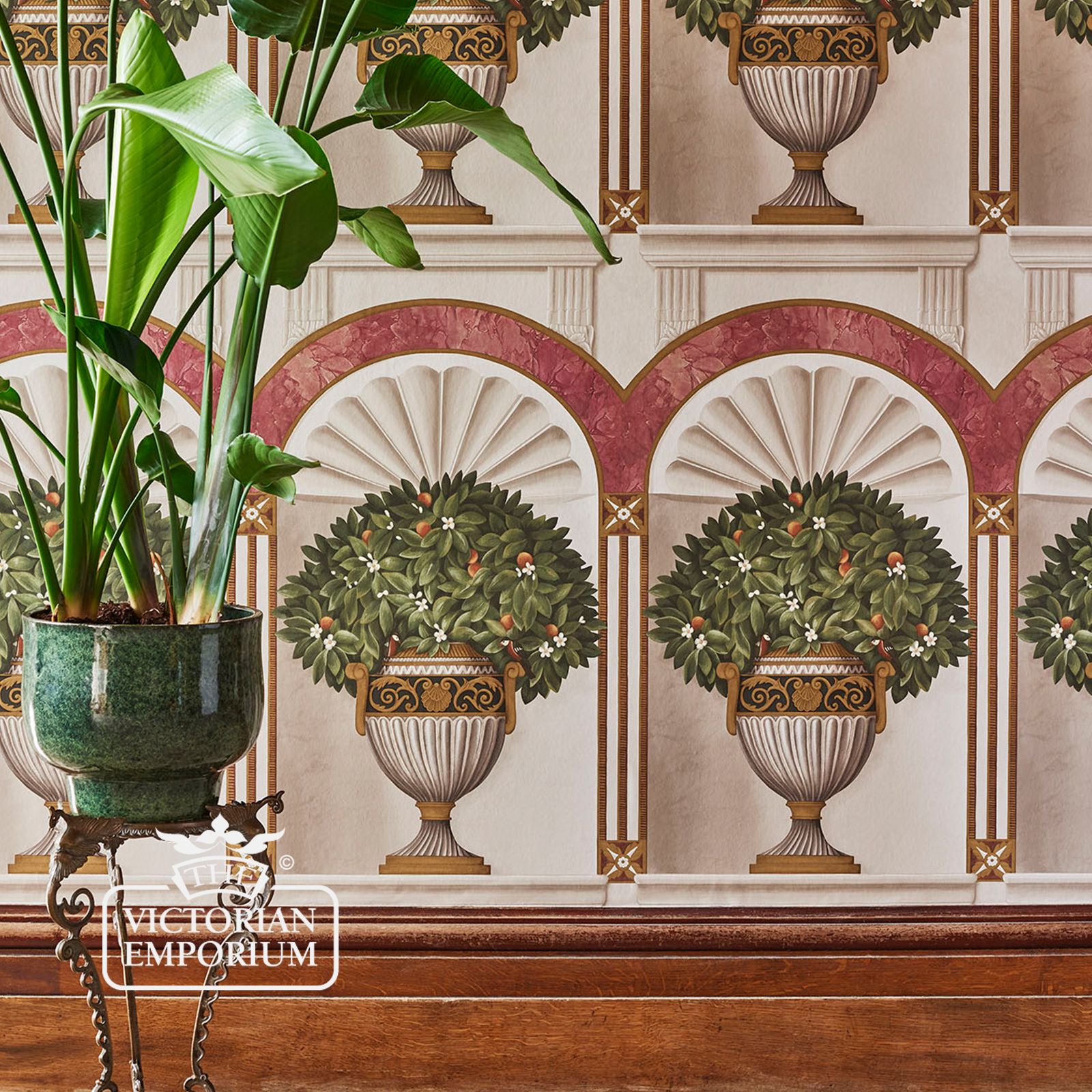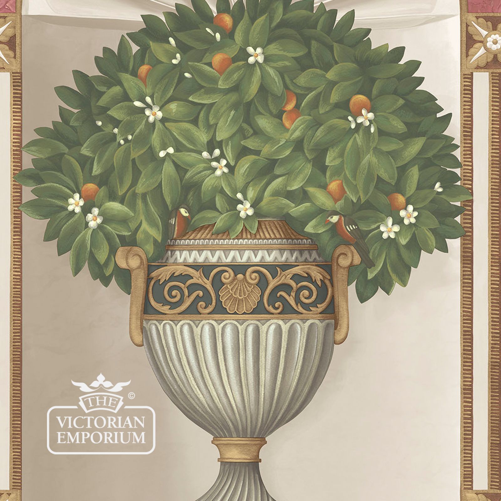This wallpaper depicts one of King William lll and Queen Mary ll’s blossoming orange trees, and features elements originally conceptualised by master artist Antonio Verrio. The design celebrates their impressive collection of various rare plants from around the globe, known as the ‘Exoticks.