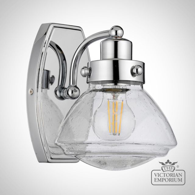 Single Bathroom Wall Light with Traditional schoolhouse shaped glass and unique curved, chamfered backplates in Polished Chrome and made from Steel and Clear Seeded Glas