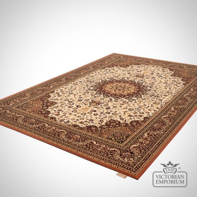 Beautiful wool rug manufactured from cut pile wilton and inspired by traditional Persian carpets. The Senator rug is distinguished by a wide, decorative frame and an intricate medallion design in the shape of a star surrounded by a stylised foliage.