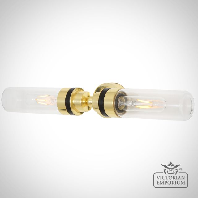 The Severn double bathroom wall light features two slim glass shades. With a vintage design element, this double glass wall lamp will add a decorative touch to bathroom spaces. It’s perfect for vanity areas and can be placed both horizontally above mirrors or vertically on either side to achieve a balanced aesthetic.