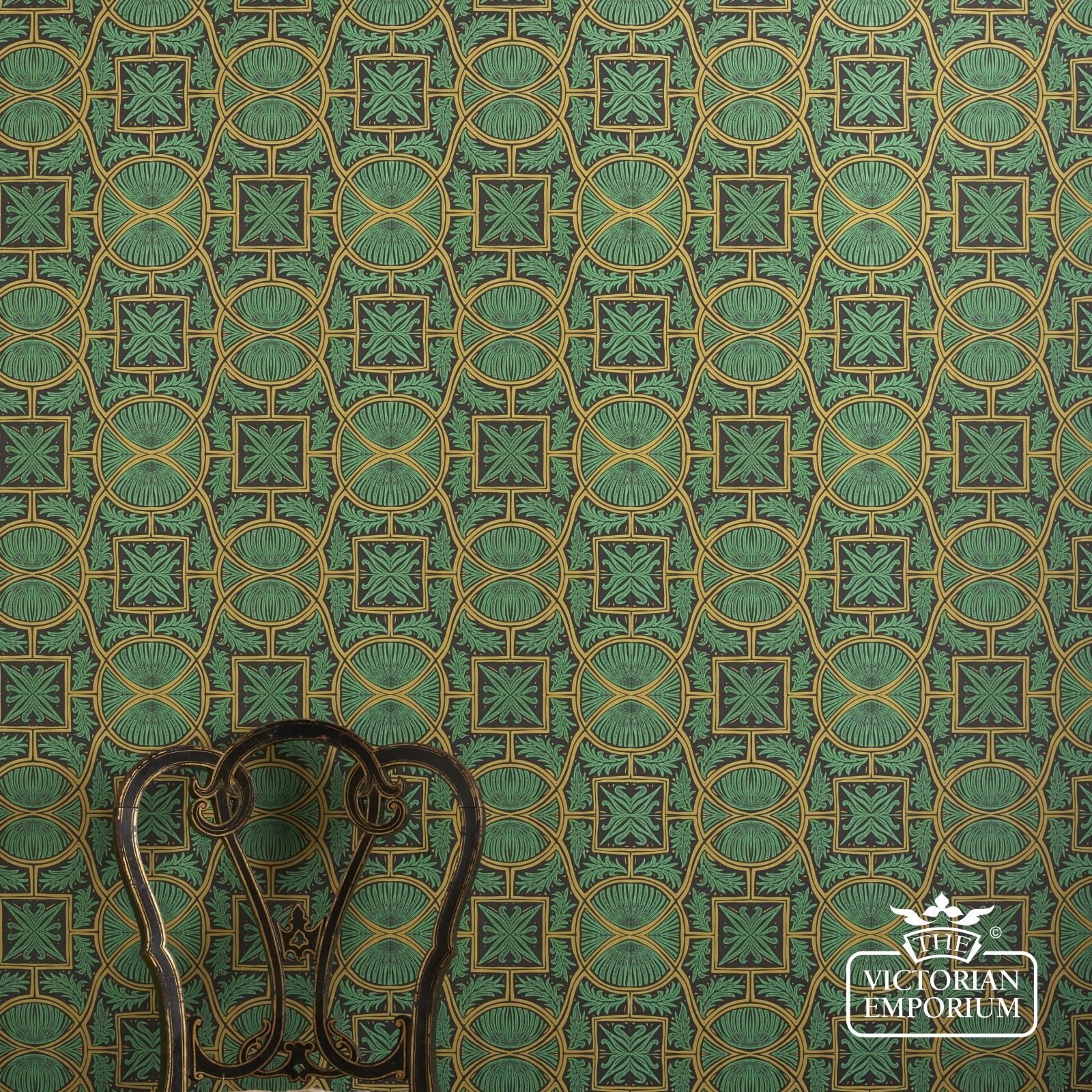 Sgt Pepper is one of our early lino block designs, inspired by a Portuguese cathedral ceiling. Reprinted on matt paper for a softer, more ‘daytime’ feel, this curling and detailed geometric design has a hint of arts and crafts. In tones of hot green, chartreuse and soft black, this works fantastically with black and brass.