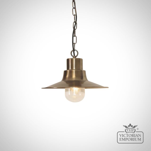 Simple outdoor period style chain lantern in a brass finish, influenced by simple barn lamps of the early 1900’s.