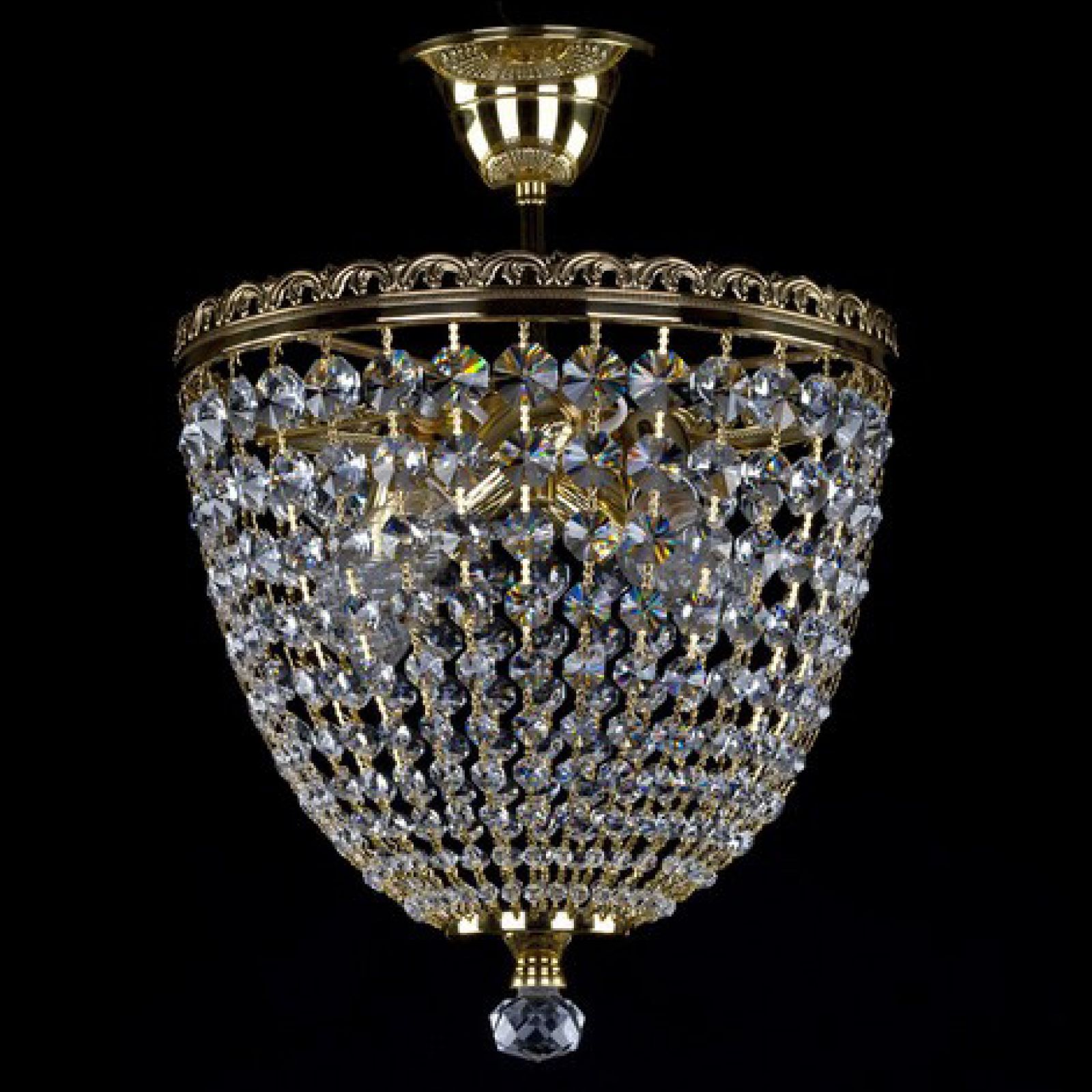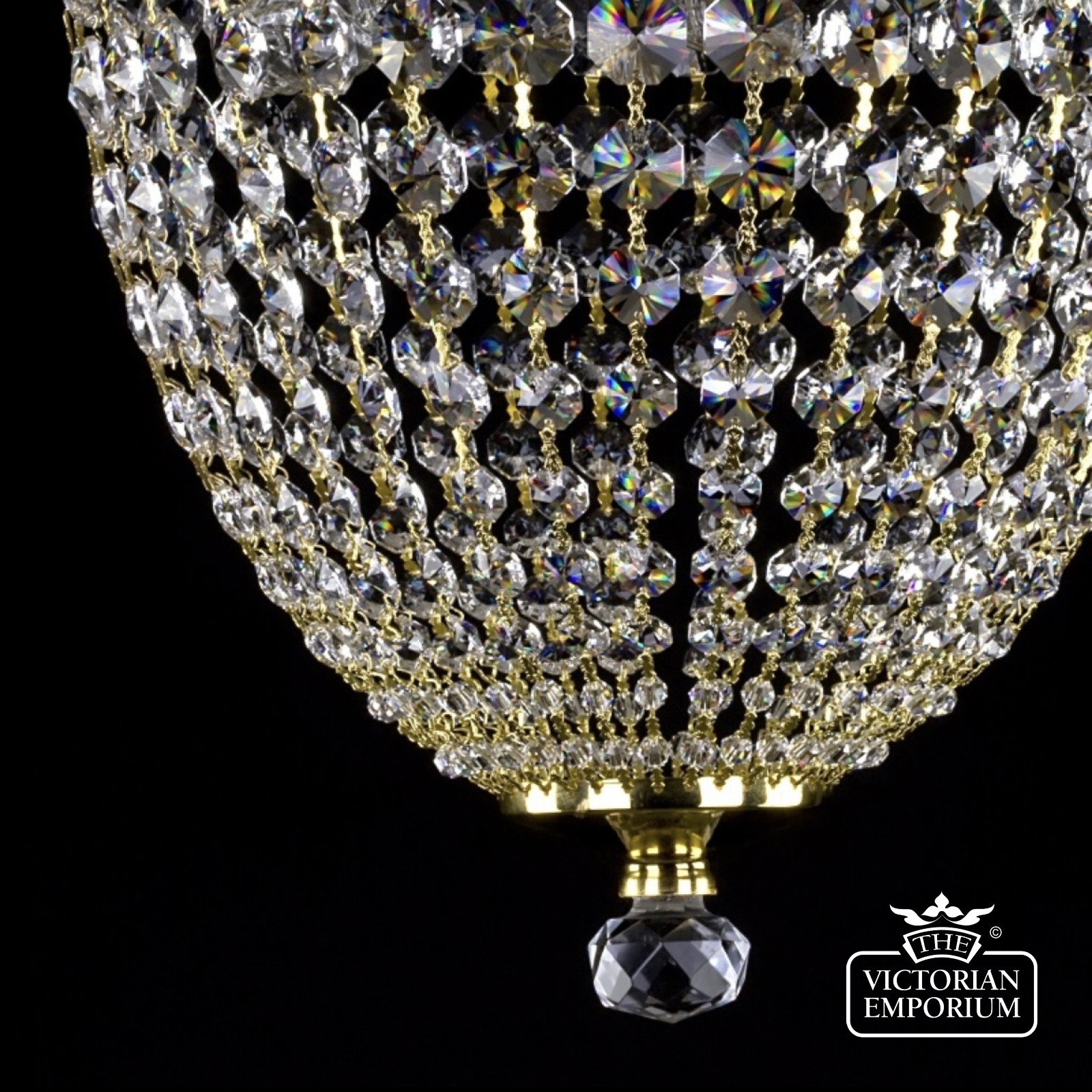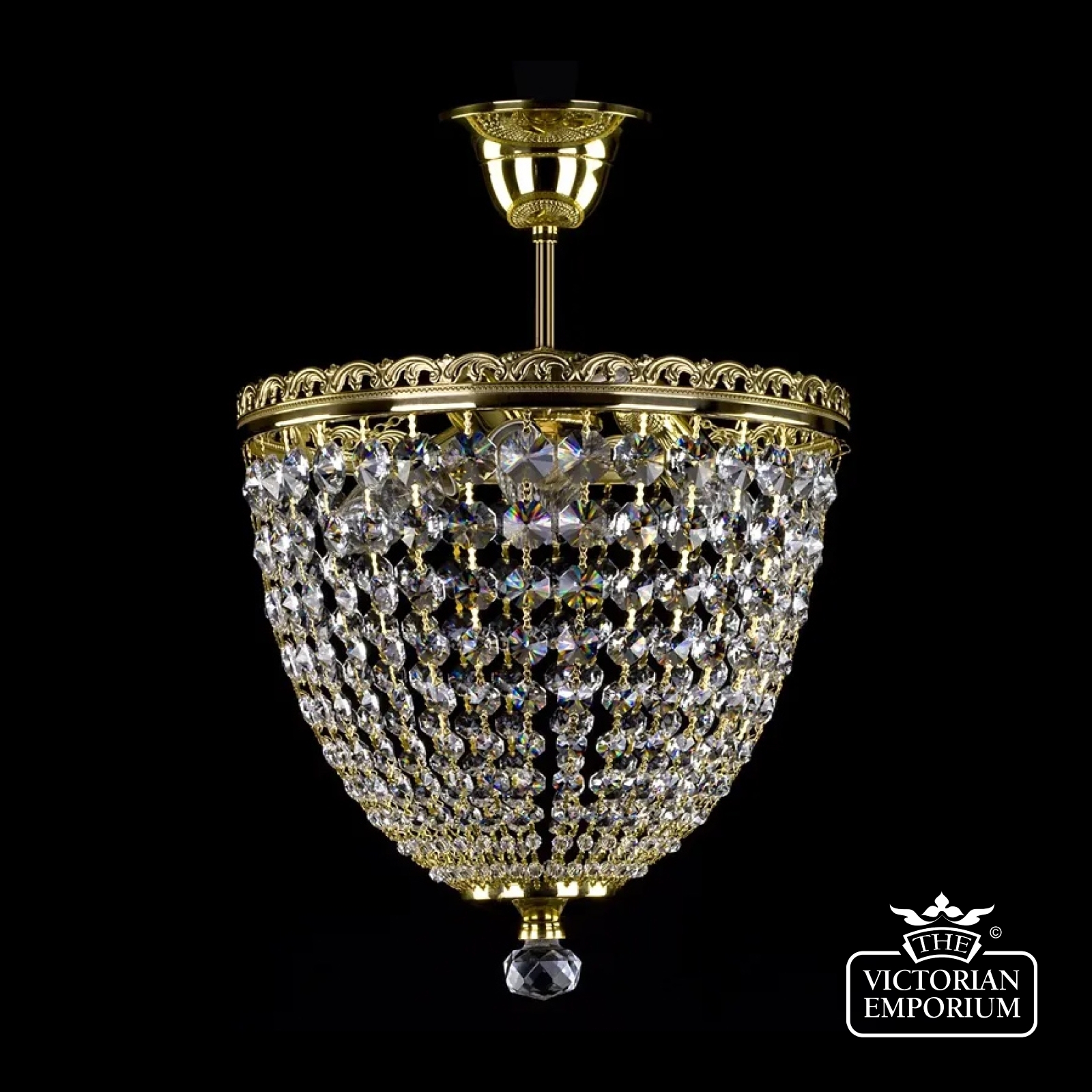 30% PbO crystal basket. Dressed with delicate bohemian crystal chains which reflect the light to create colours of the spectrum. Polished brass ornate frame. For standard ceilings, over a dinning table, hallway, or sitting area.